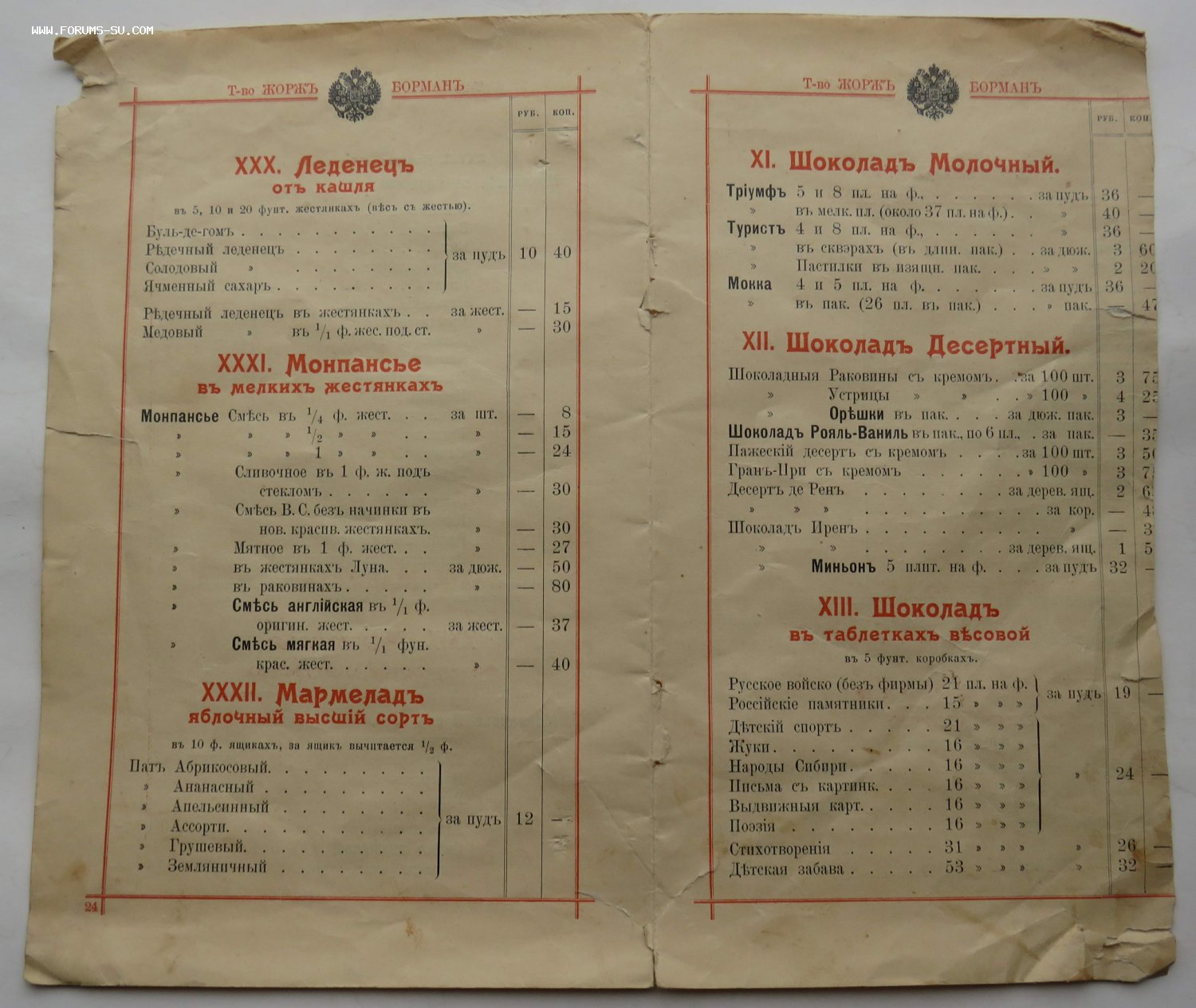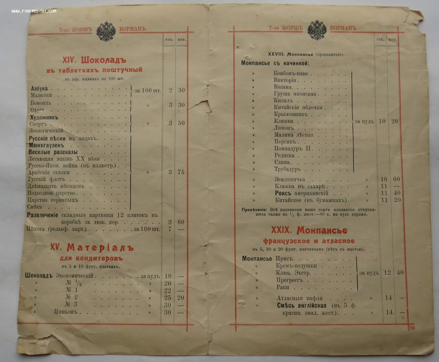 Лист из дореволюционного каталога прейскуранта кондитерских изделий товарищества Жорж Борман.