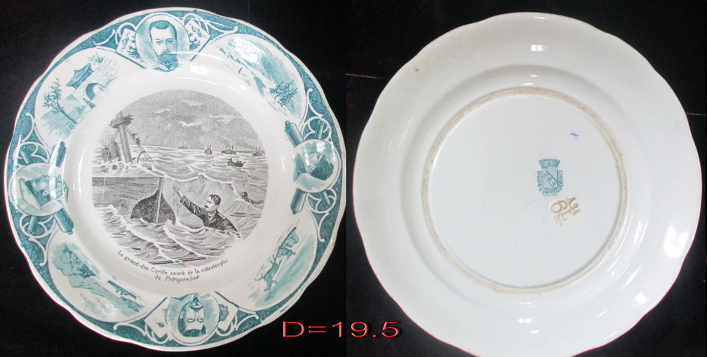 Тарелка была изготовлена на французкой монофактуре Digoin&Sarreguemines в Латарингии в память о войне 1904-1905г.г. На тарелке изображено чудесное спасение великого князя Кирилла Владимировича, при гибели крейсера Петропавловск.Тарелка в прекрасном коллекционном состоянии,деколь,фаянс. Франция нач.20 века. D=19,5 см.МПЦ 6000р