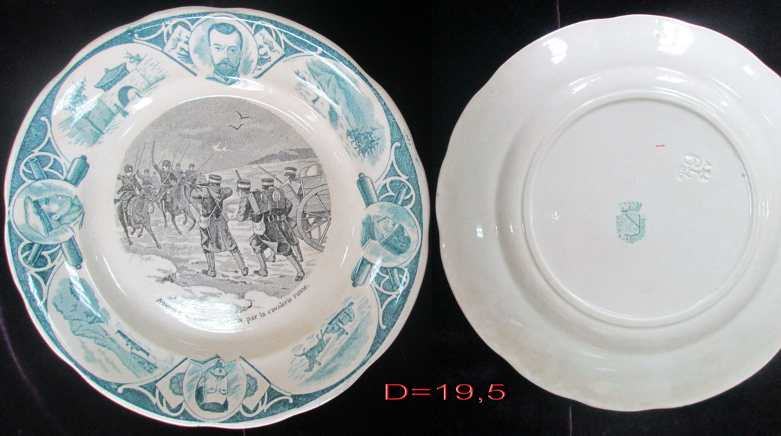 Тарелка была изготовлена на французкой монофактуре Digoin&Sarreguemines в Латарингии в память о войне 1904-1905г.г. На тарелке изображен один из эпизодов войны, атака на японский конвой русской кавалерией.Тарелка в прекрасном коллекционном состоянии,деколь,фаянс. Франция нач.20 века. D=19,5 см. МПЦ 6000р