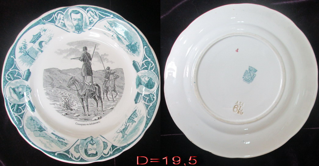 Тарелка была изготовлена на французкой монофактуре Digoin&Sarreguemines в Латарингии в память о войне 1904-1905г.г. На тарелке изображен один из эпизодов войны, казачий разъезд.Тарелка в прекрасном коллекционном состоянии,деколь,фаянс. Франция нач.20 века. D=19,5 см.