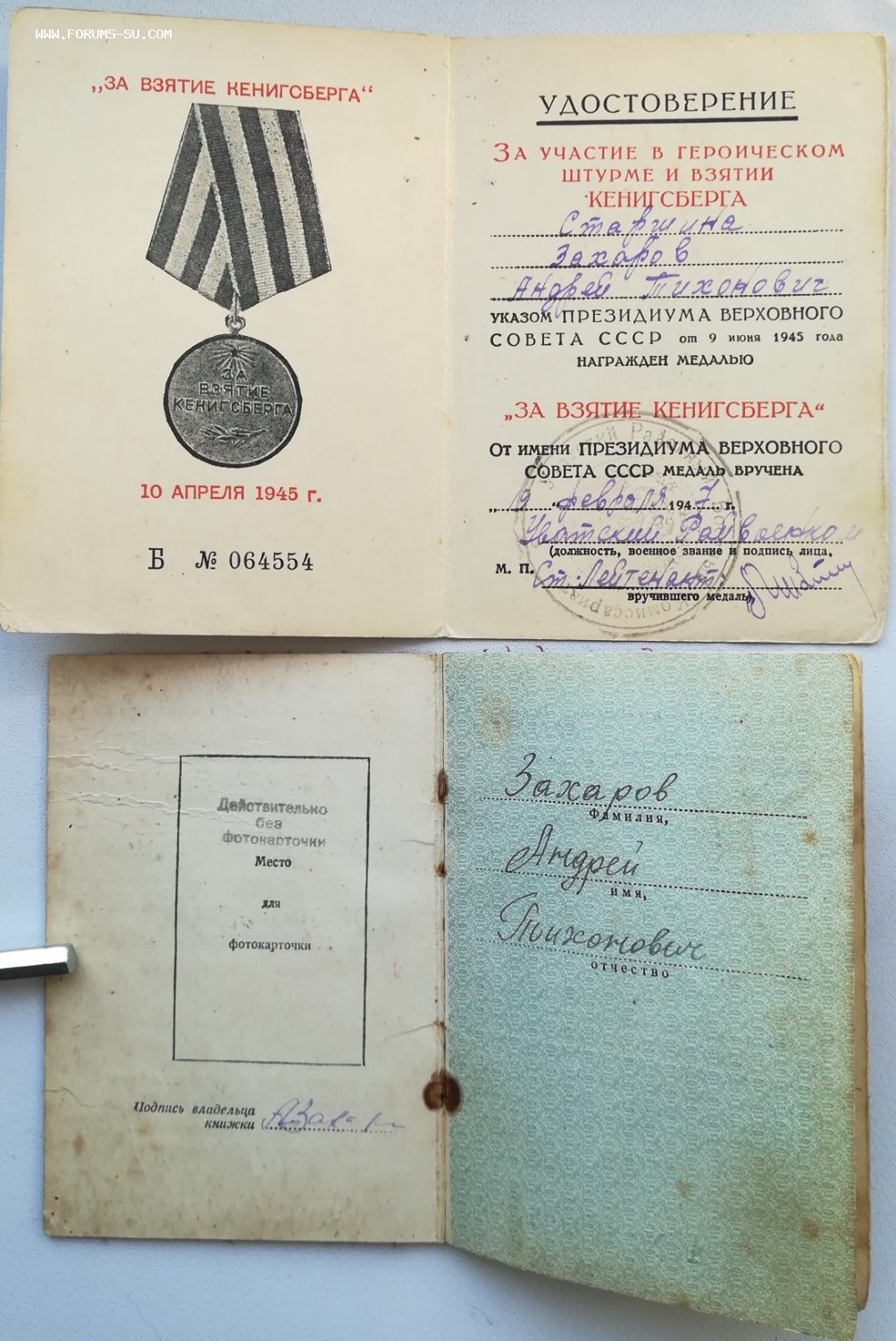 КЗ №1.О26.617 за гору Сапун и КЗ №2.О58.371 за Литовскую ССР (отчество на Подвиге народа на вторую КЗ - Тимофеевич) + док Кенигсберг.