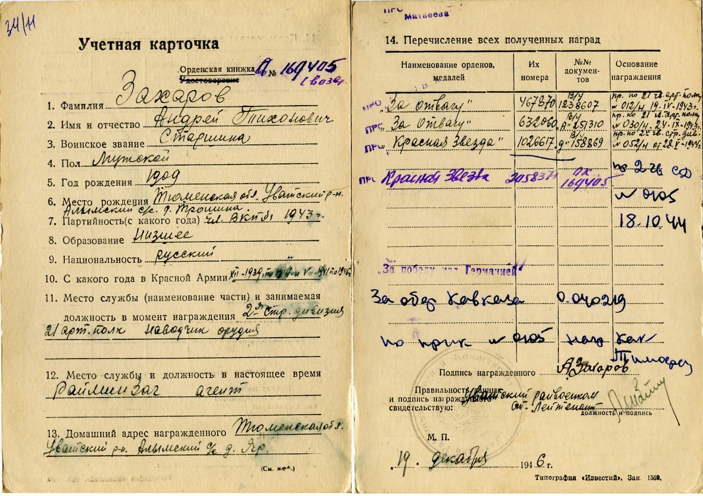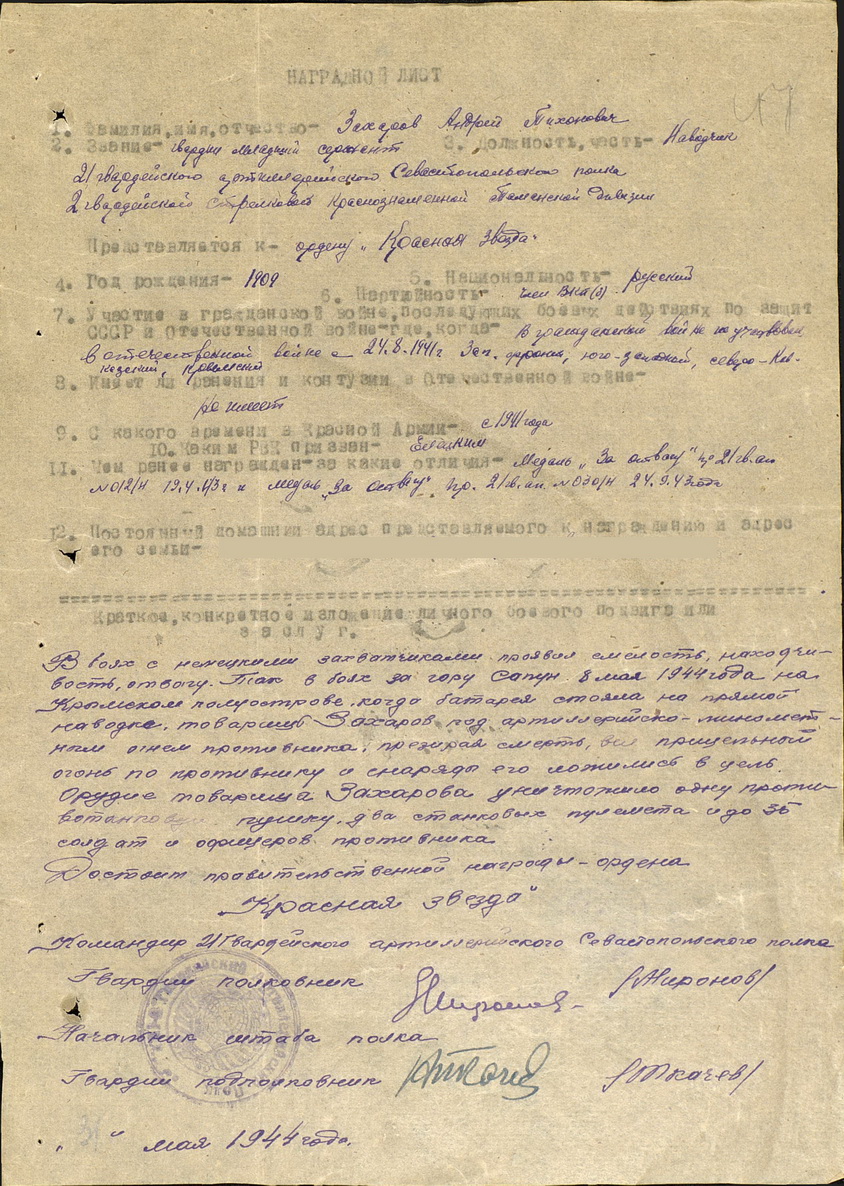 Две КЗ на доке на артиллериста - Гвардии мл. сержант Захаров Андрей Тихонович (Тимофеевич) 1909г.р. - наводчик 4-й батареи 21 гв. артиллерийского Севастопольского полка 2 гв. Краснознаменной стрелковой дивизии.