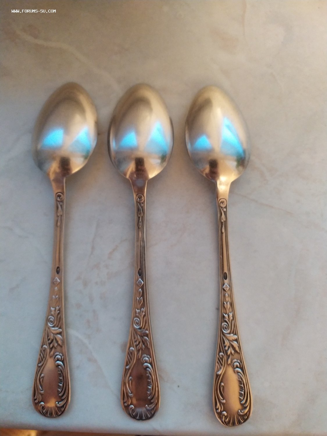 Три серебряные чайные ложки с двухсторонним узором.