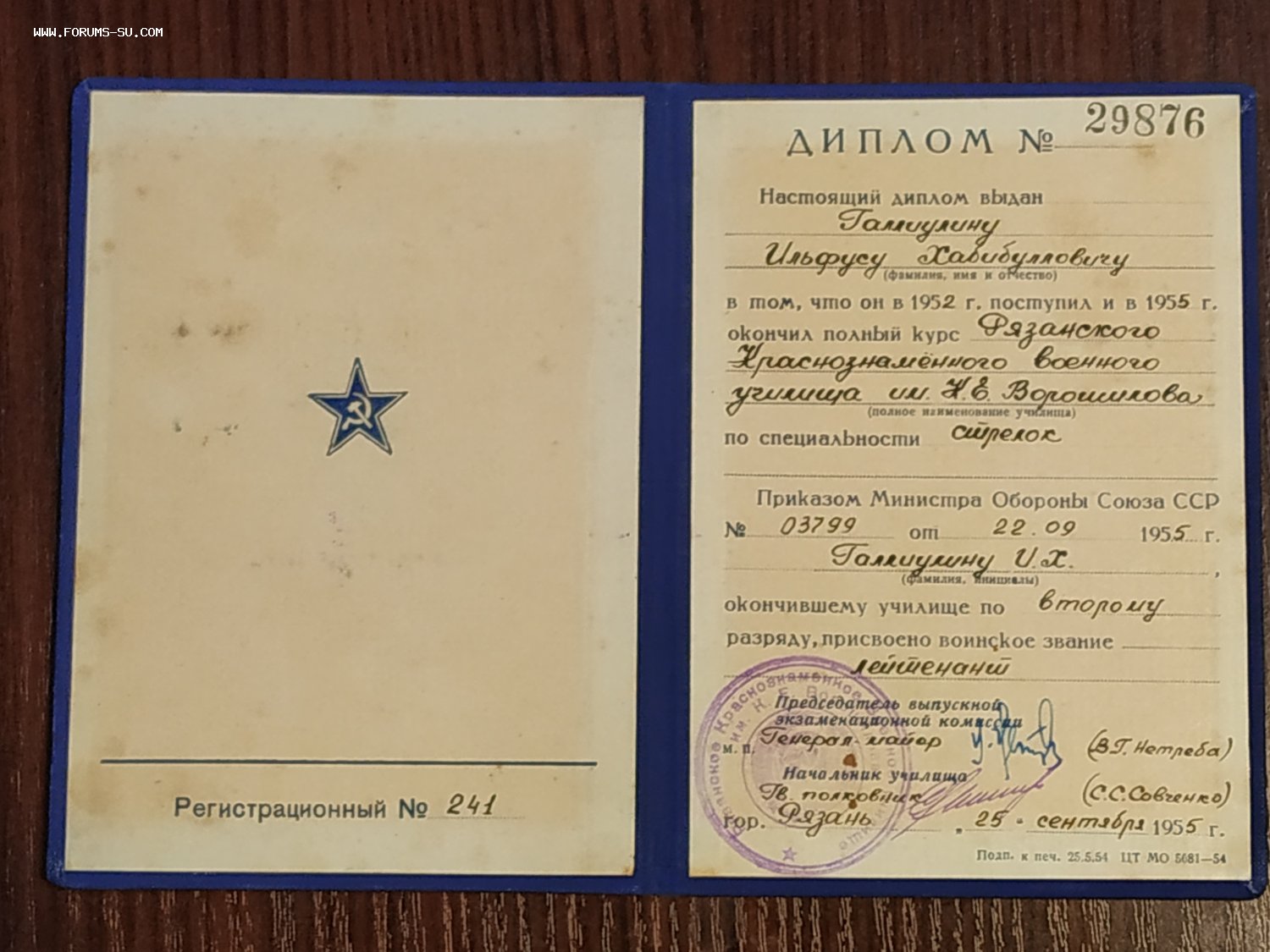 Диплом Рязанского Краснознамённого военного училища им Ворошилова.