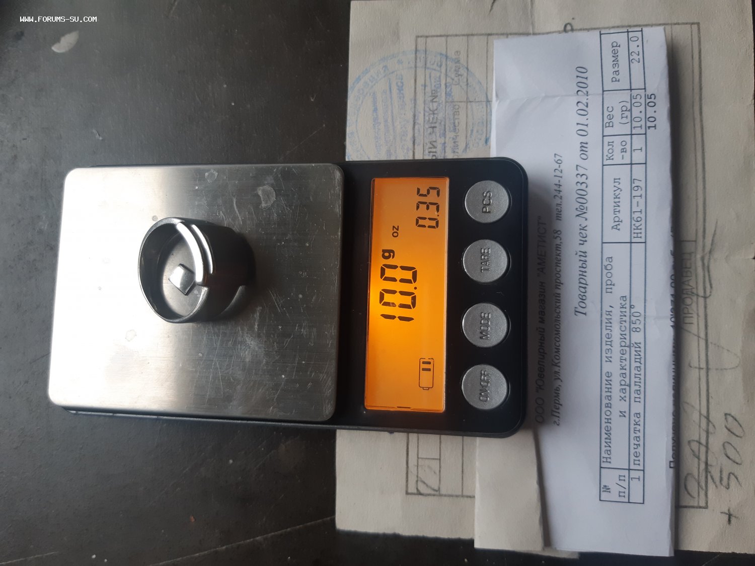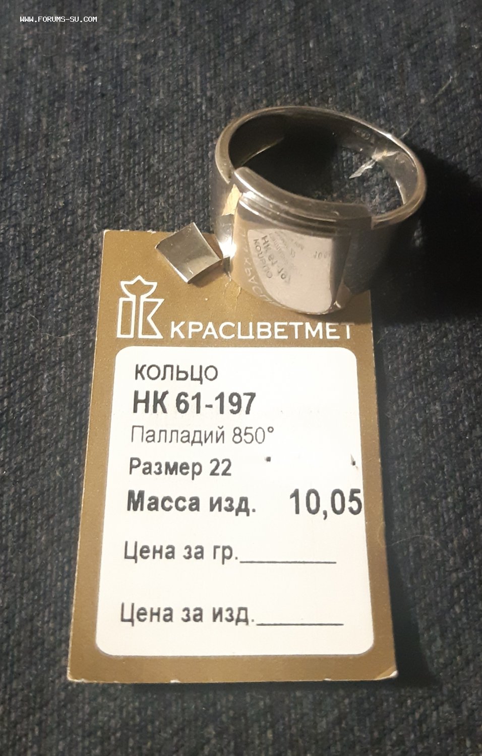 Вес 10 гр, размер был 22. Кольцо было укорочено. Размер легко востановить, фрагмент рядом с кольцом на фото.