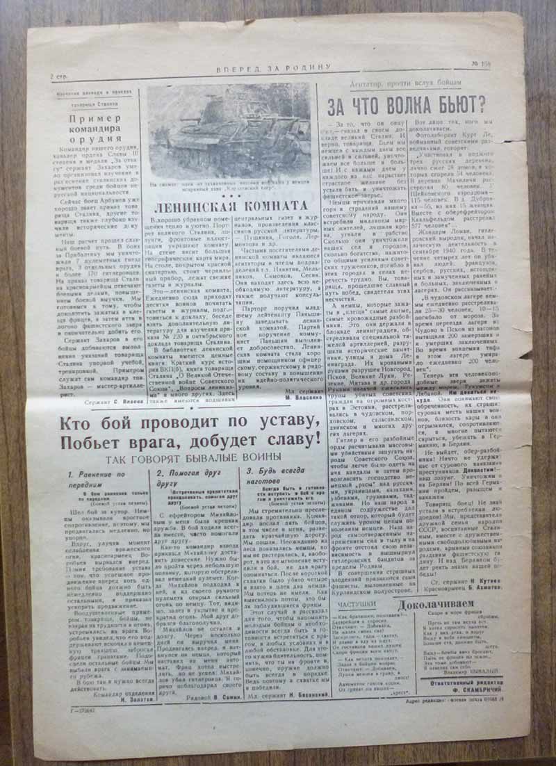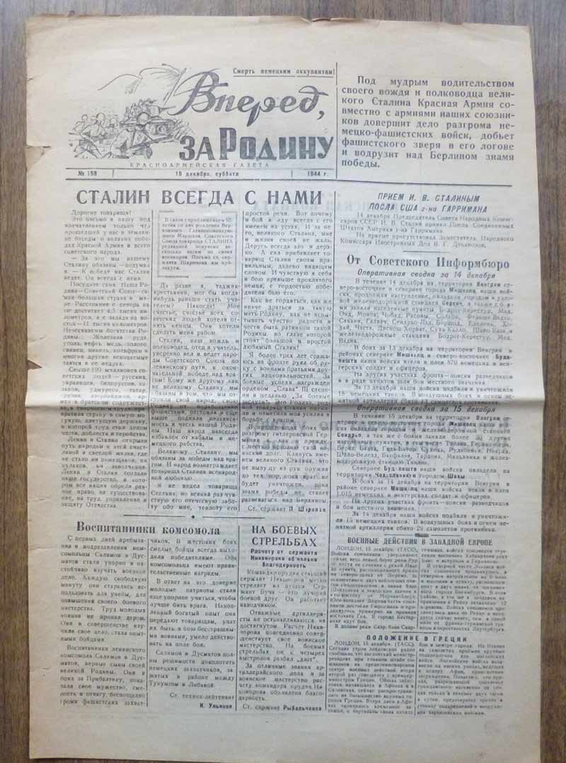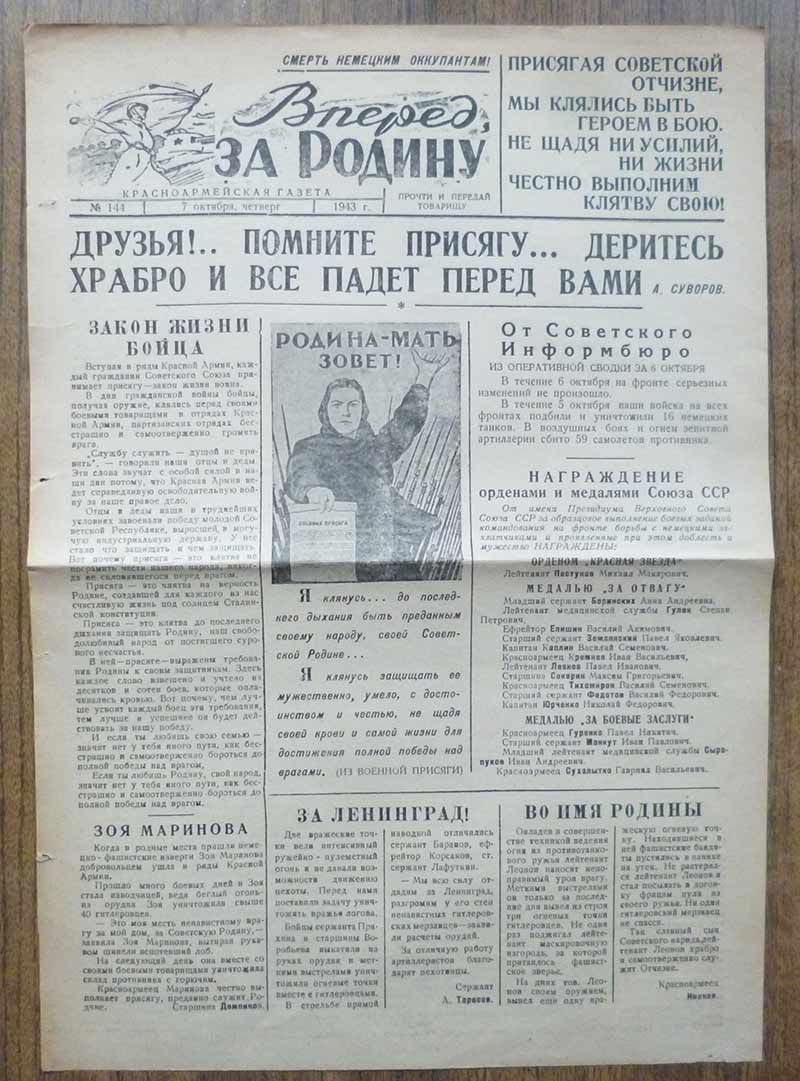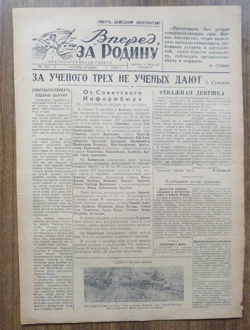 Красноармейская газета "Вперед. За Родину" октябрь 1943 года