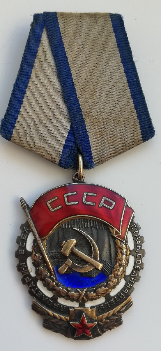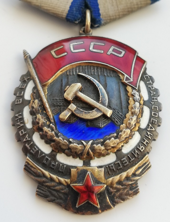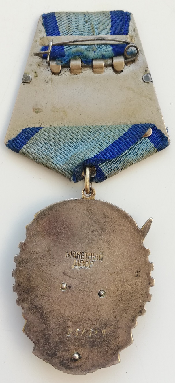 Разновидность 3. Картуш с красной эмалевой звездой сужается кверху, верхняя поверхность картуша имеет меньшую ширину, чем нижняя. В слове СОЕДИНЯЙТЕСЬ риска над буквой Й присутствует у всех знаков данной разновидности. Минимальный известный номер ордена 243837, максимальный – 253974.