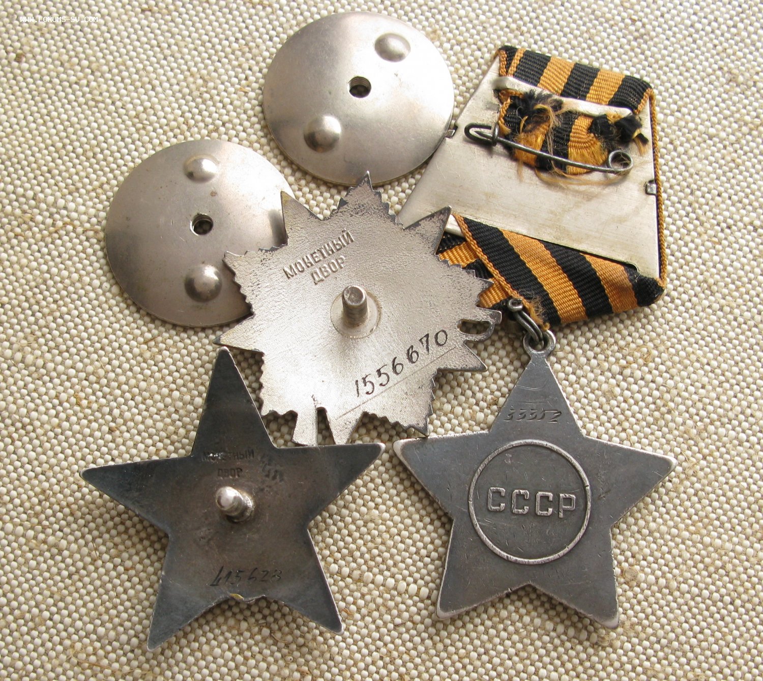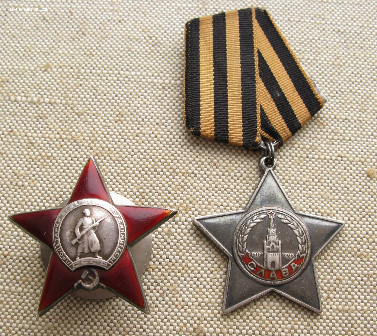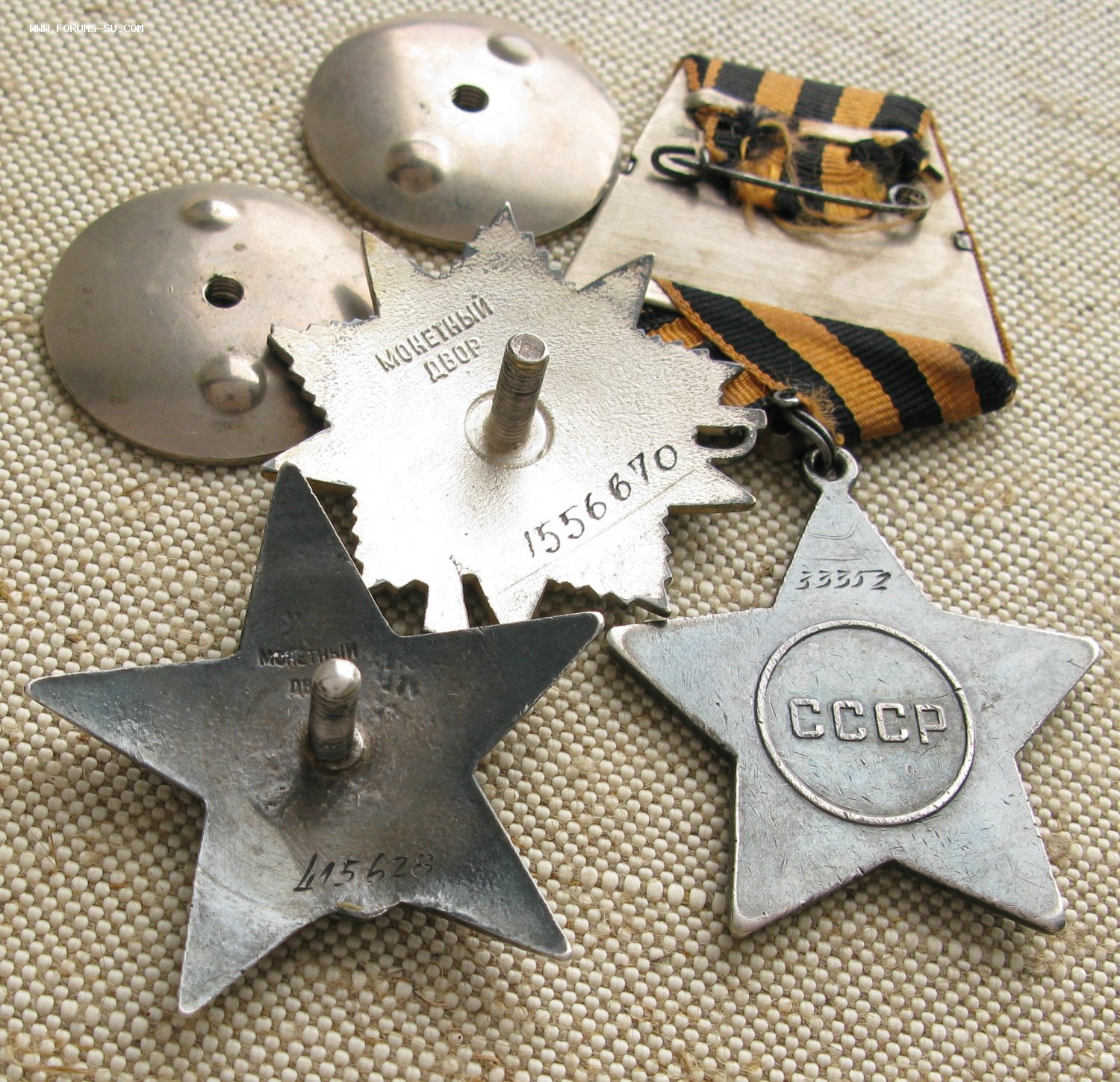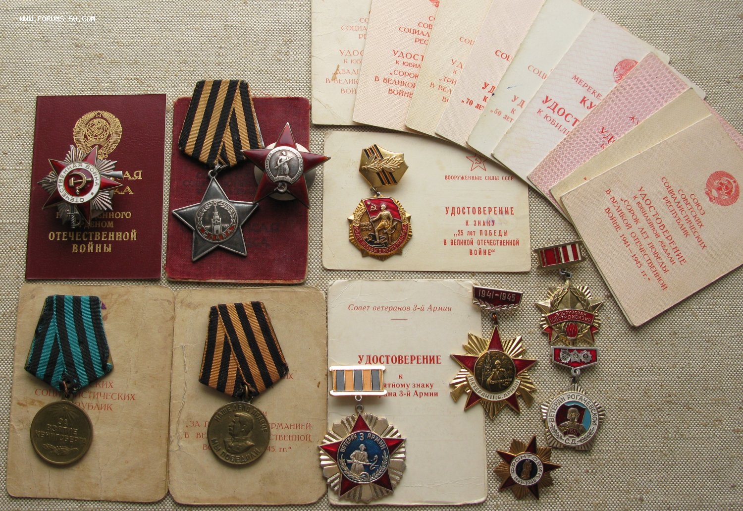 Комплект с документами Орден Красной Звезды 415628 Орден Славы 3й степени 33352 Орден Отечественной Войны 1й степени 1556670 + Медали