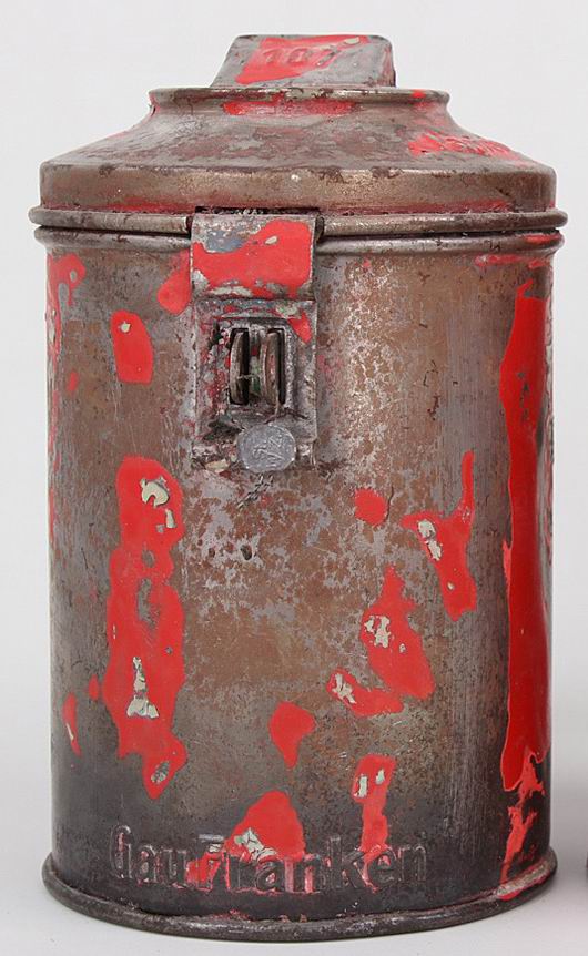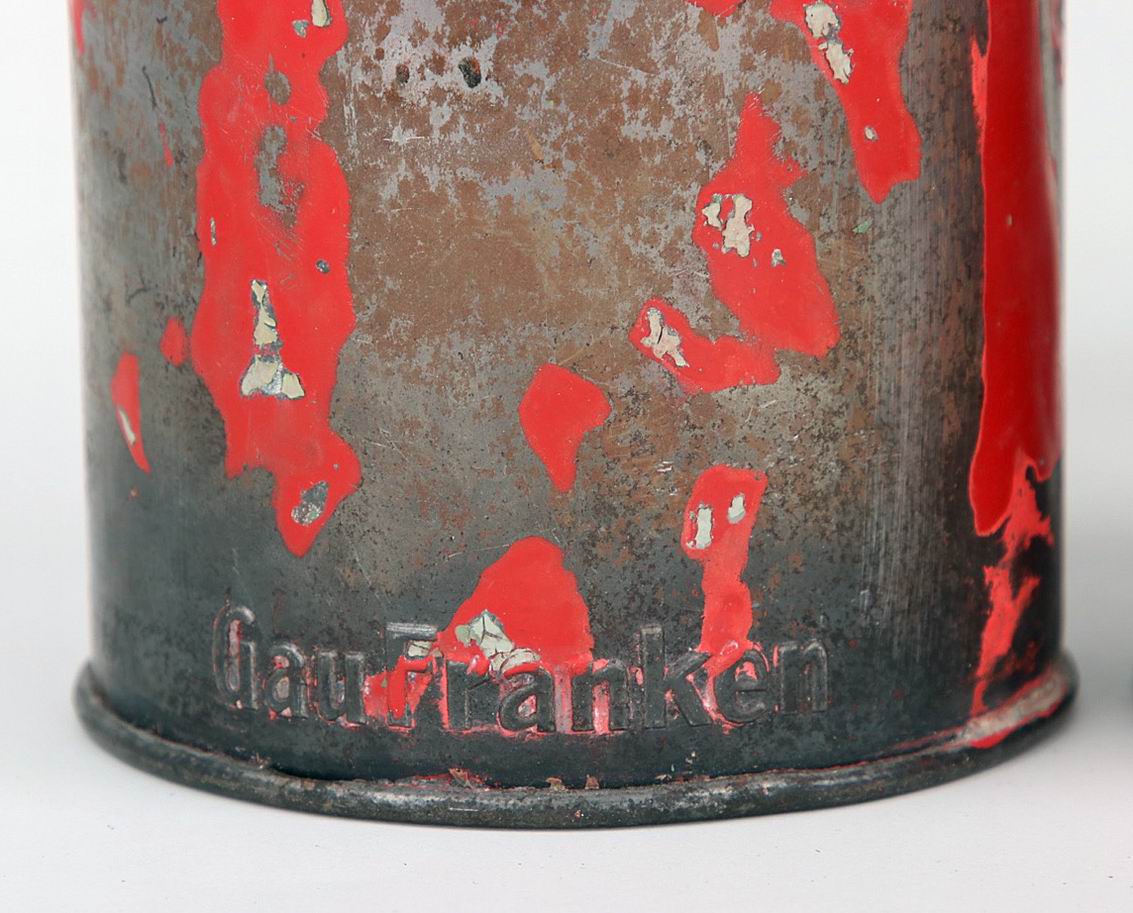 На донышке имеется маркировка производителя. Также на копилке выбита надпись «Gau Franken» область Franken (НСДАП).