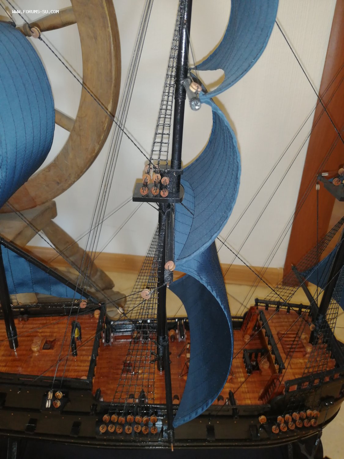 Штурвал крутится. Паруса всегда натянуть, по кромке стоит проволка.