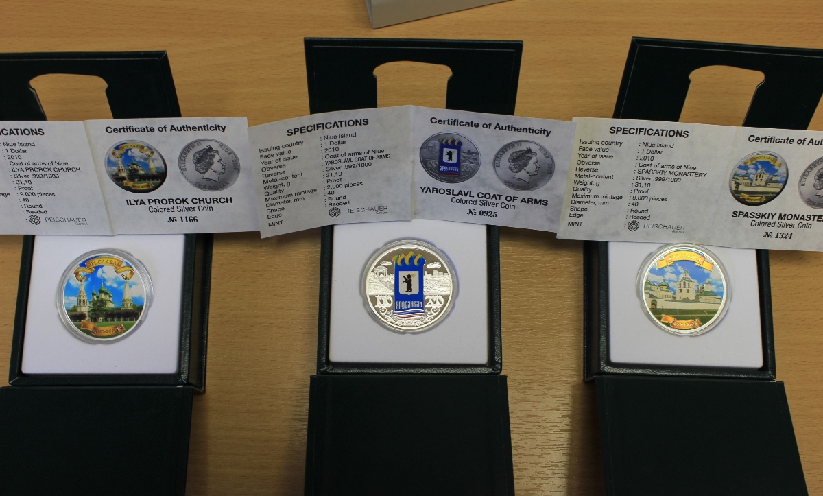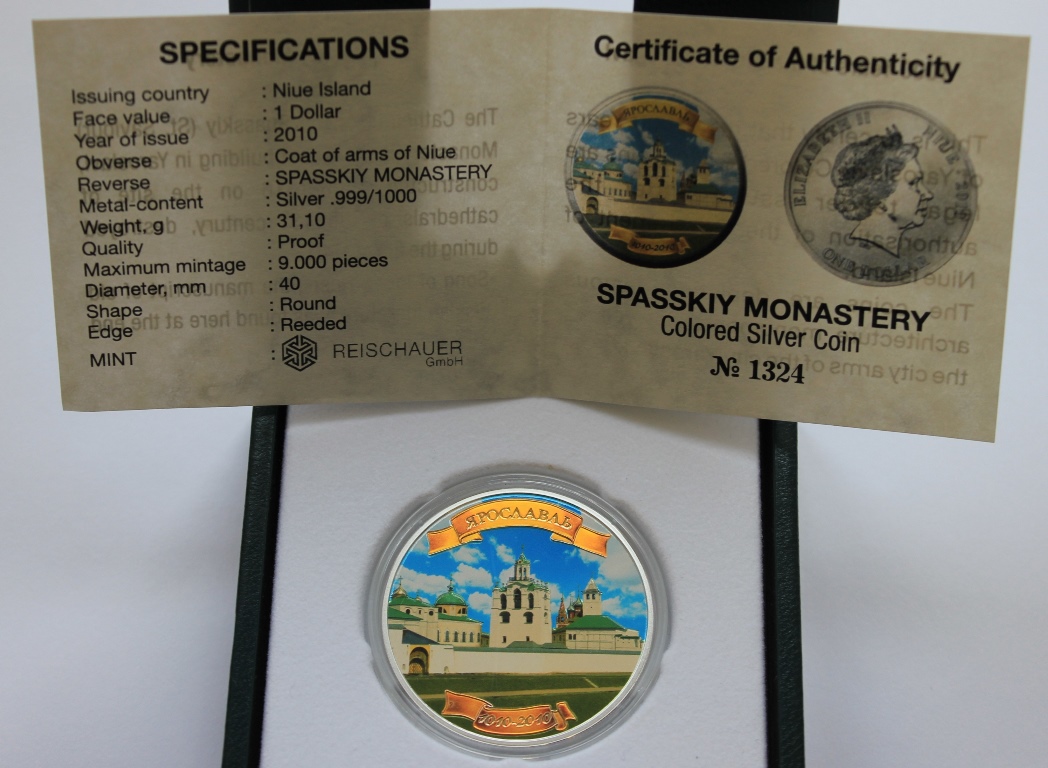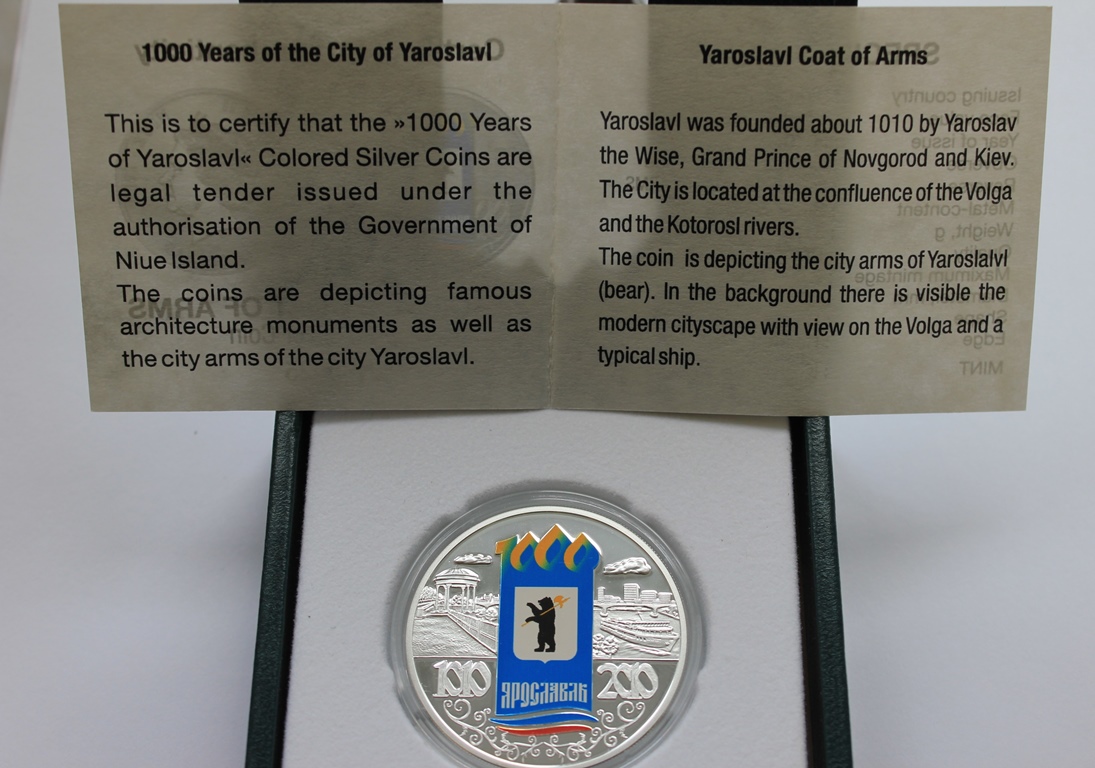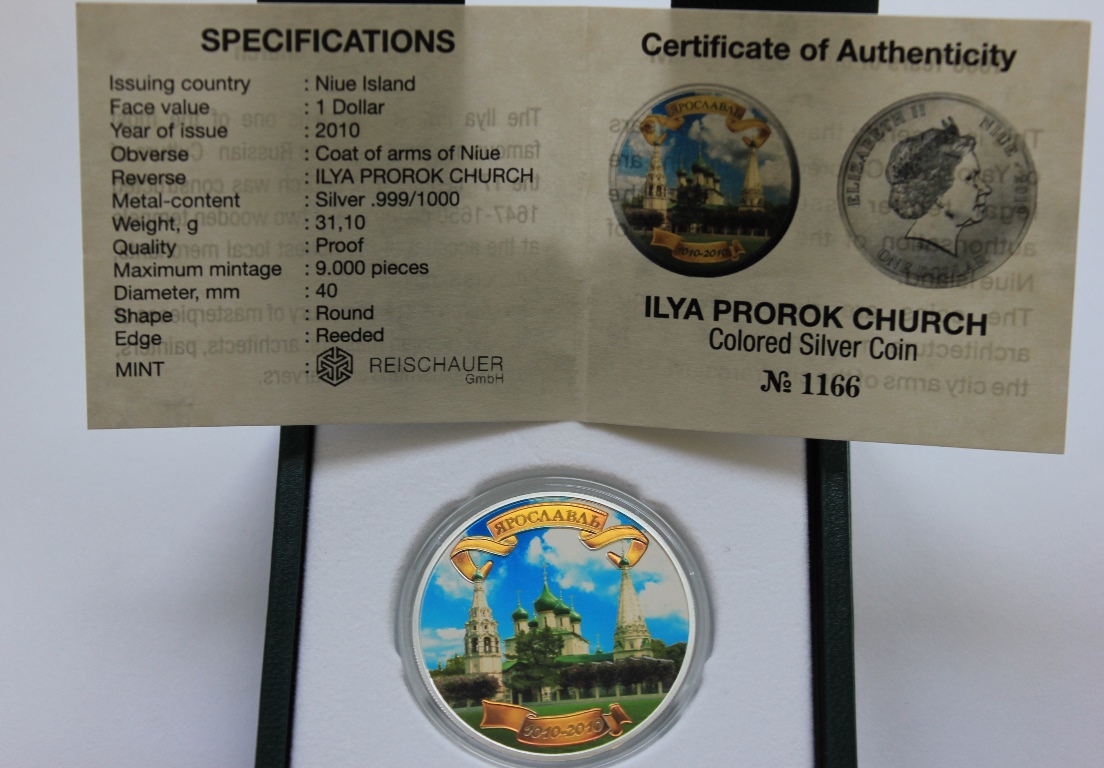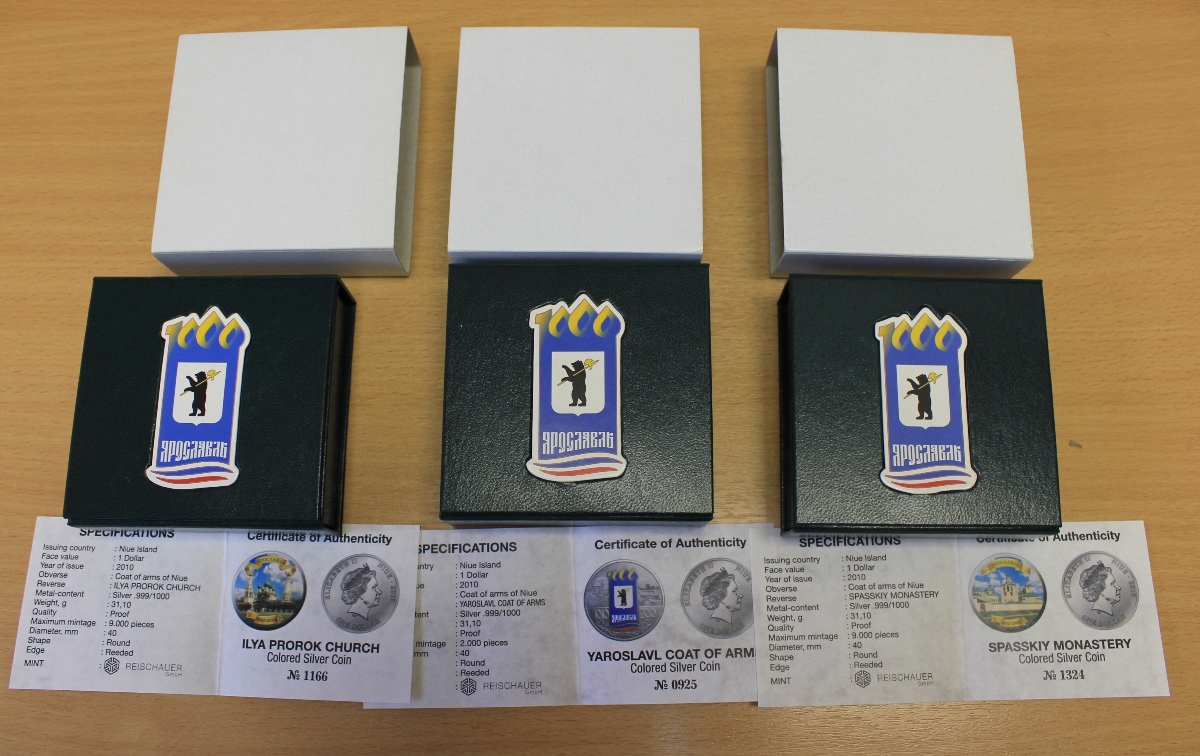 1 доллар 2010 г. Ограниченный выпуск к 1000-летию города Ярославля. ПОЛНЫЙ КОМПЛЕКТ ИЗ 3-Х МОНЕТ: Церковь Ильи Пророка. Ярославль (герб). Спасский монастырь . Коробки, футляры, сертификаты!!! В отличном состоянии. ПРУФ.