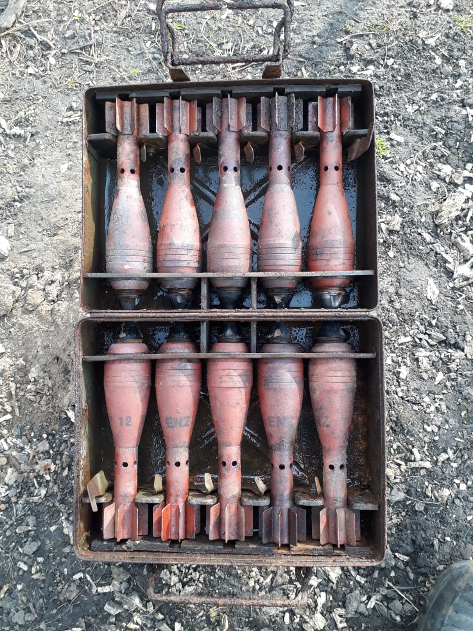 Укладка мин 50-мм в родном ящике. Мины в родной краске. Деактивирован взрыватель. ВВ отсутсвует.