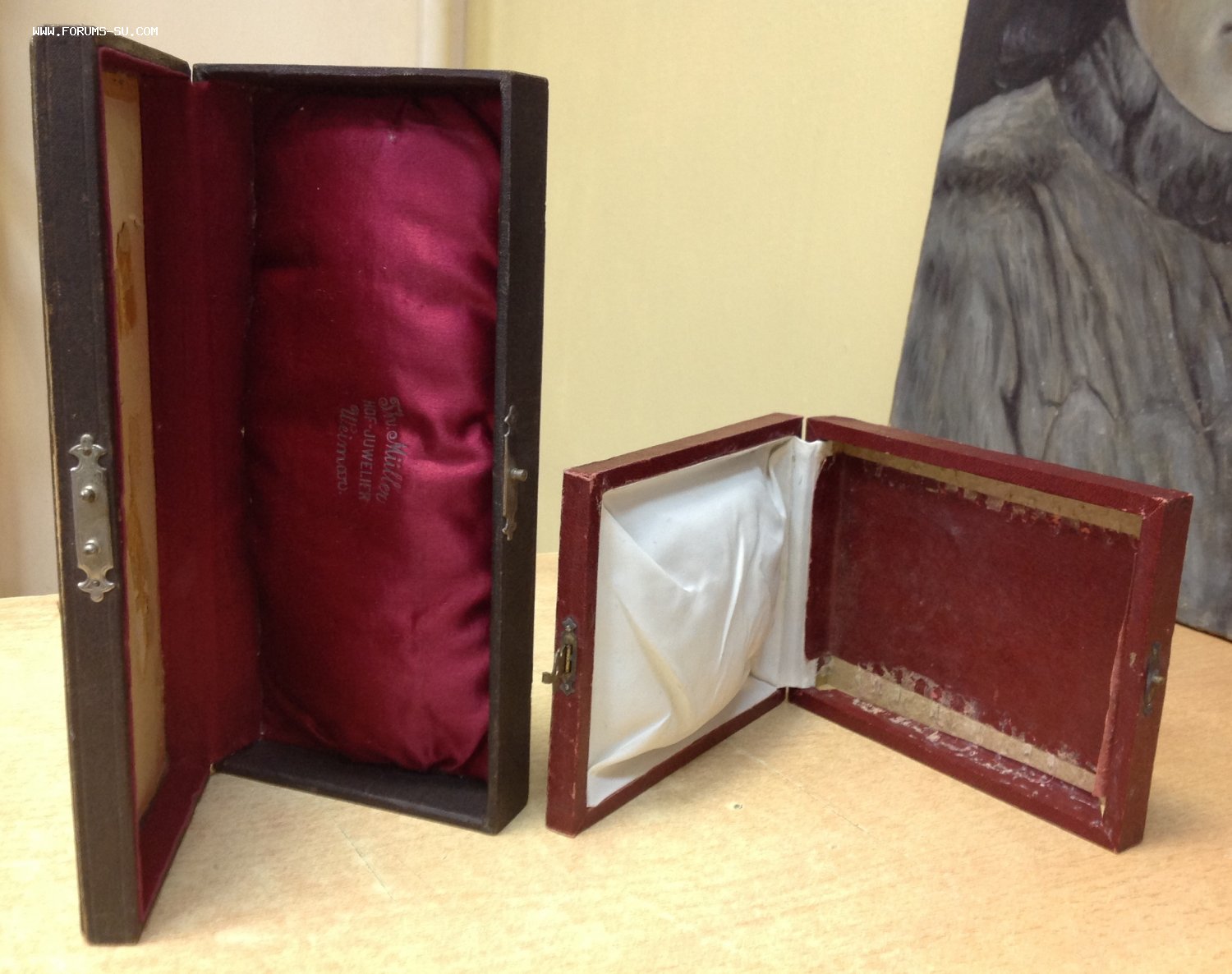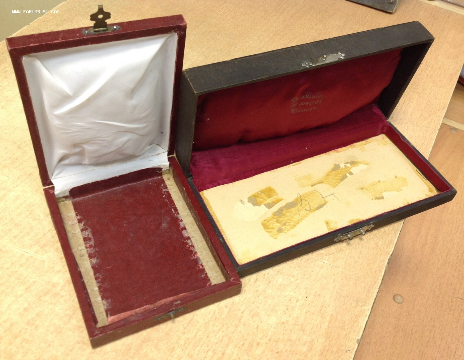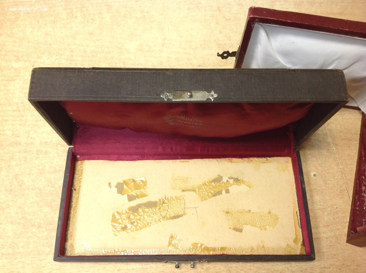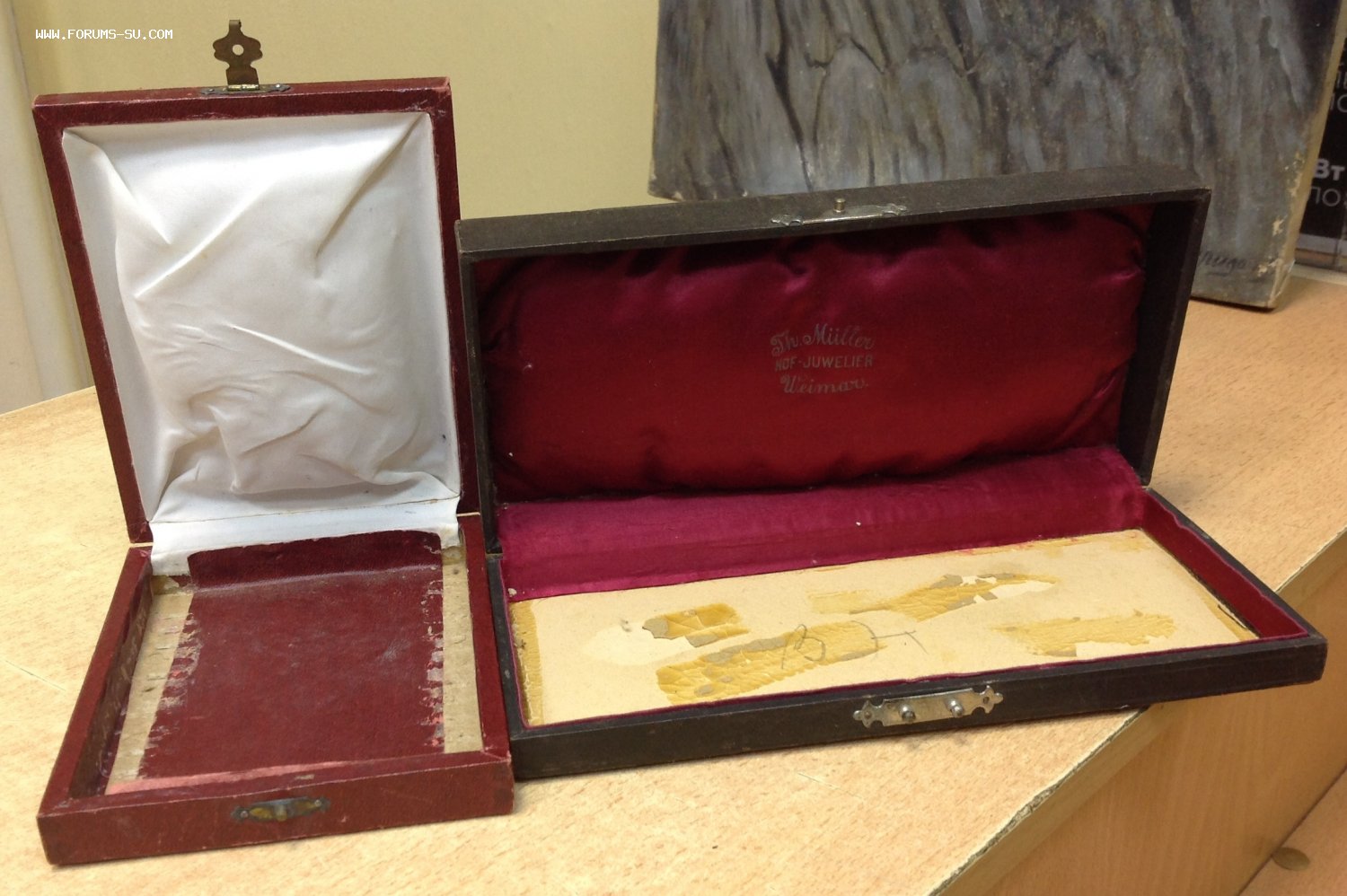 Размер коробки Ювелирного дома Мюллер 23,5 см на 11 см . Толщина 4,5 см. Размер бордовой коробки 15 см 12 см. Толщина 3 см. Отсутствуют ложементы. Предложите по РФ!