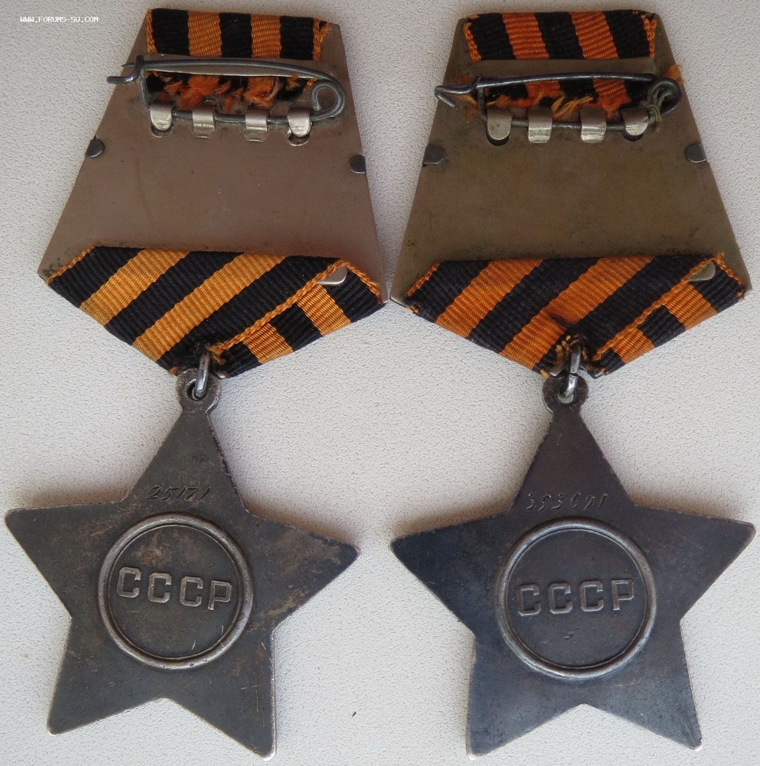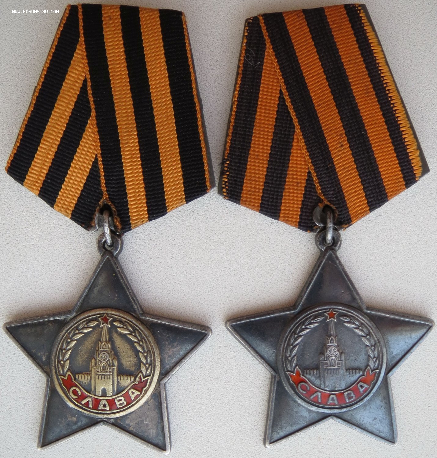 Отличная пара, коллекционное неношеное состояние, звенья целые. Но есть микроскольчик на ленте у второй степени. Возрастной красноармеец 1897 года рождения. Вторая степень - за Берлин.