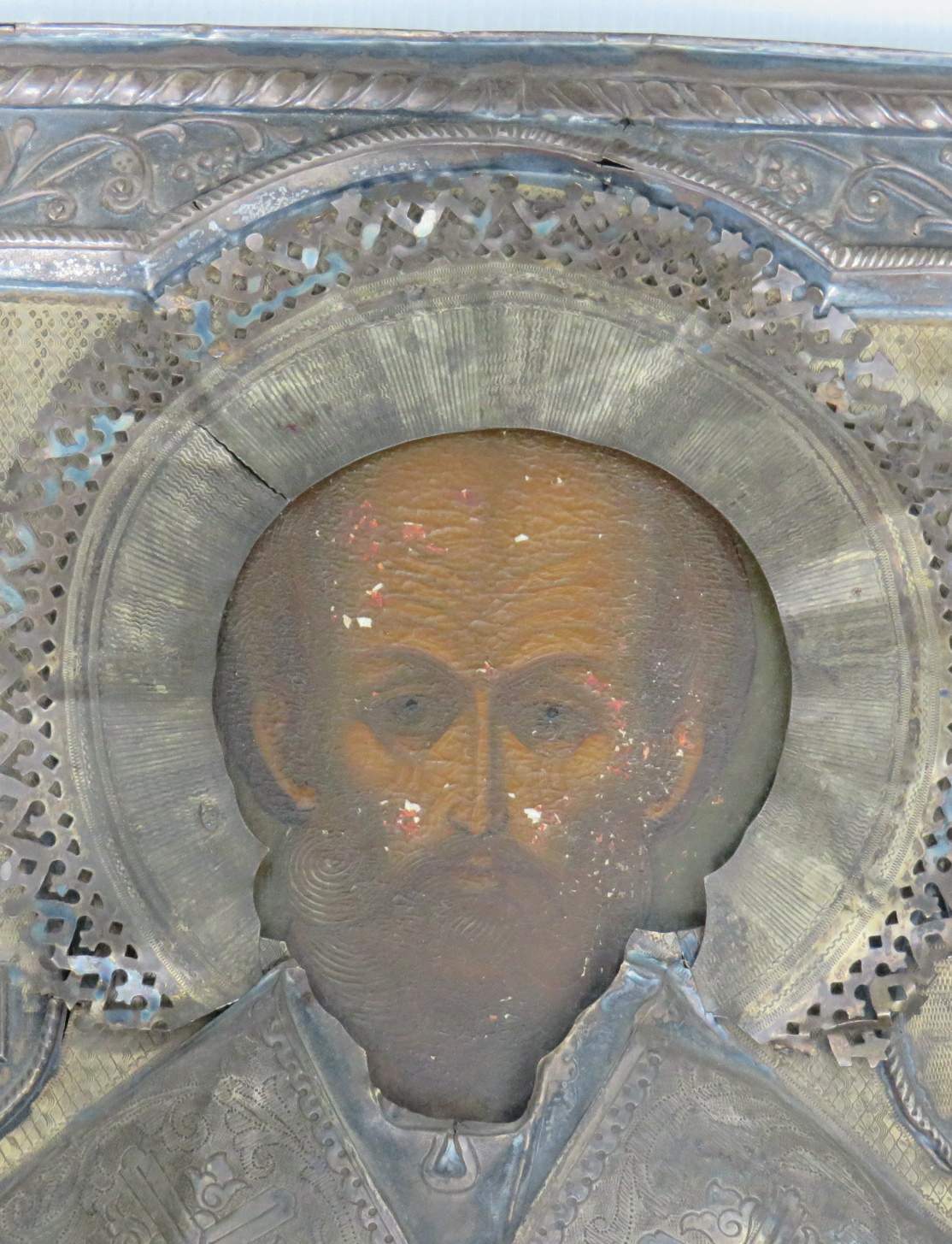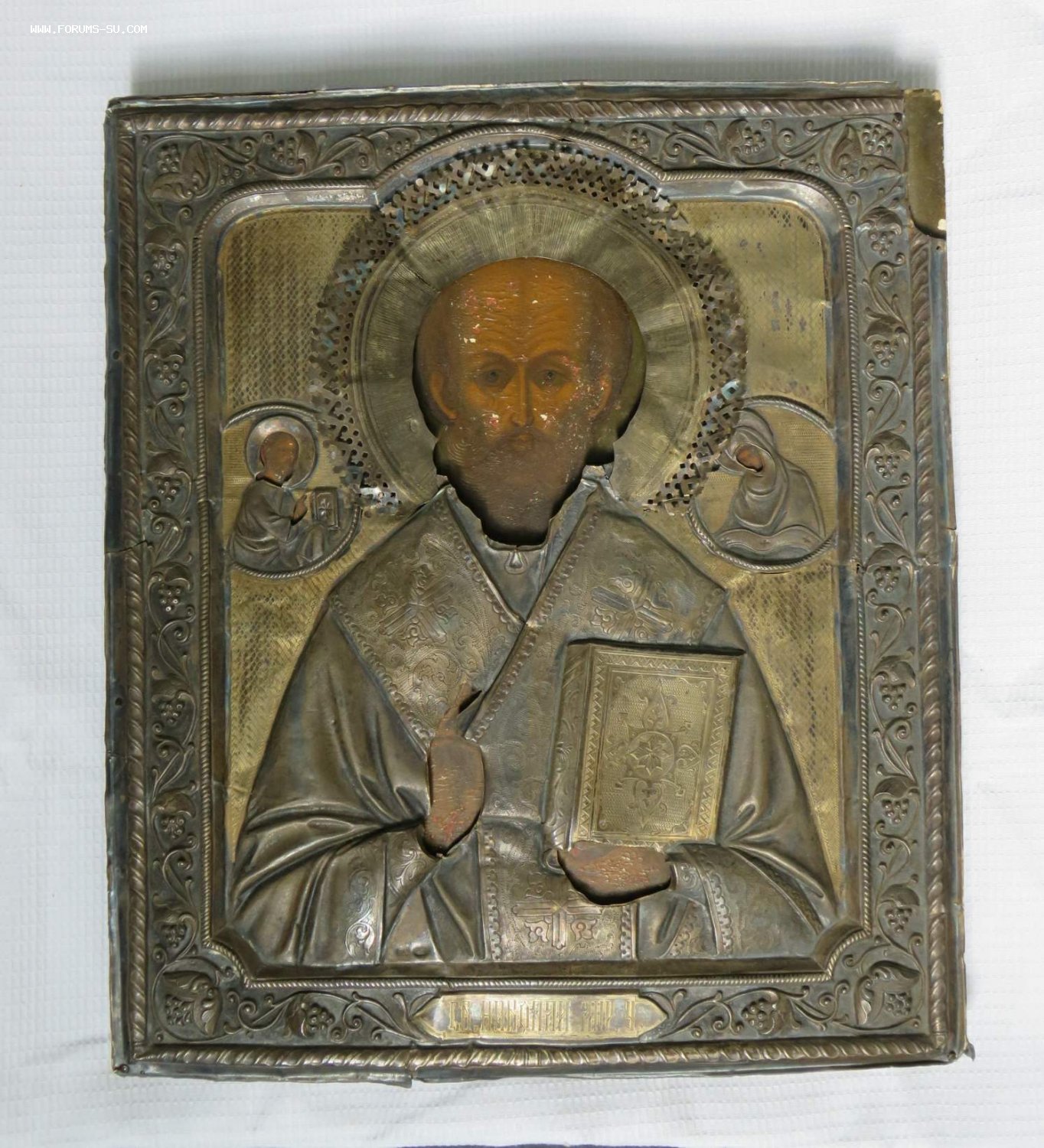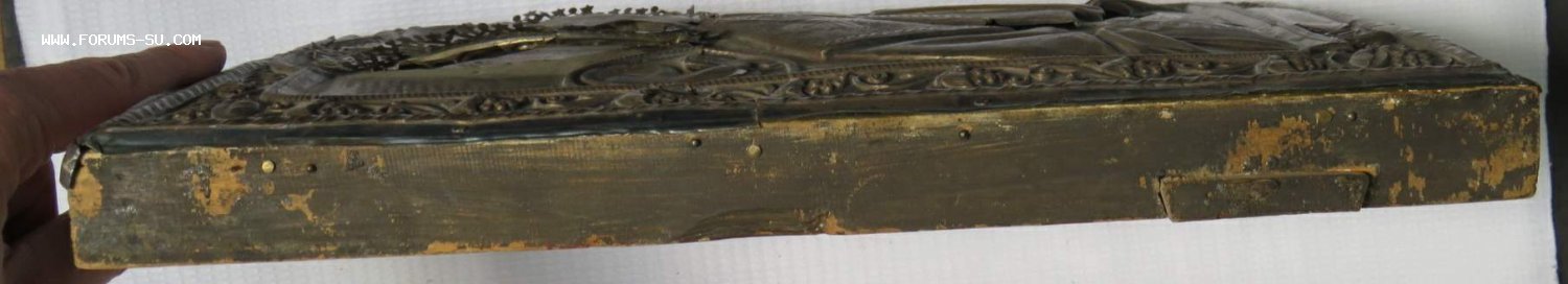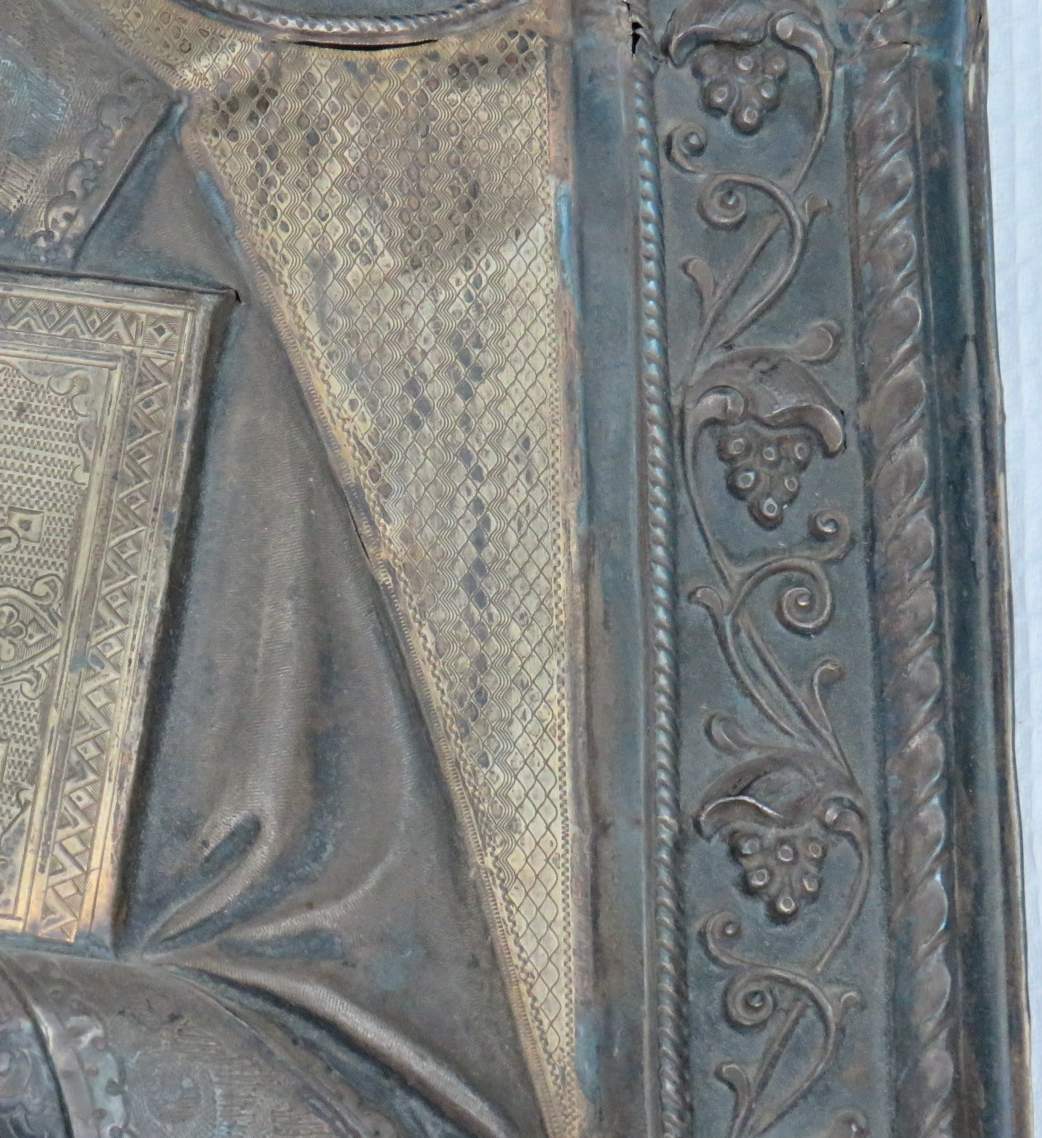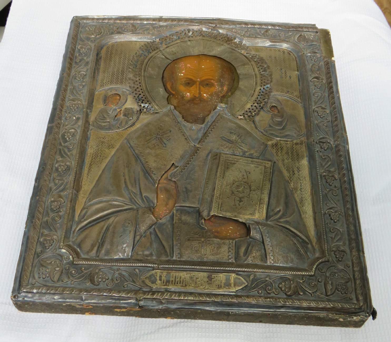 Большая икона в кованном серебряном окладе Николай Чудотворец 84 проба.