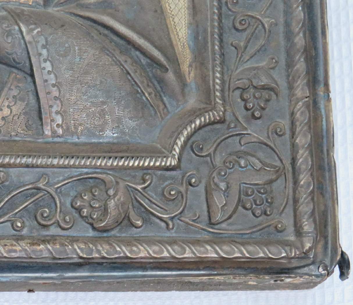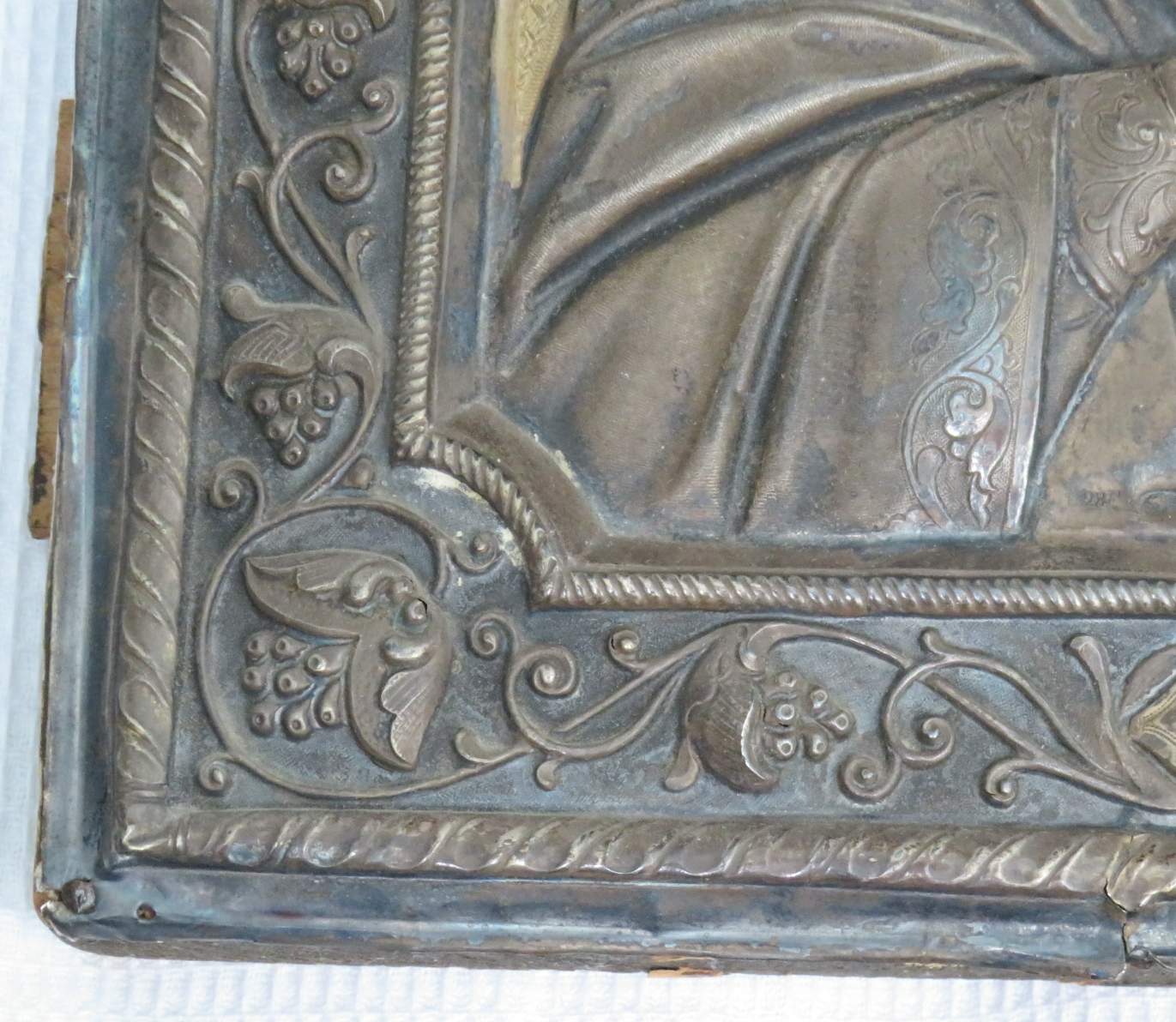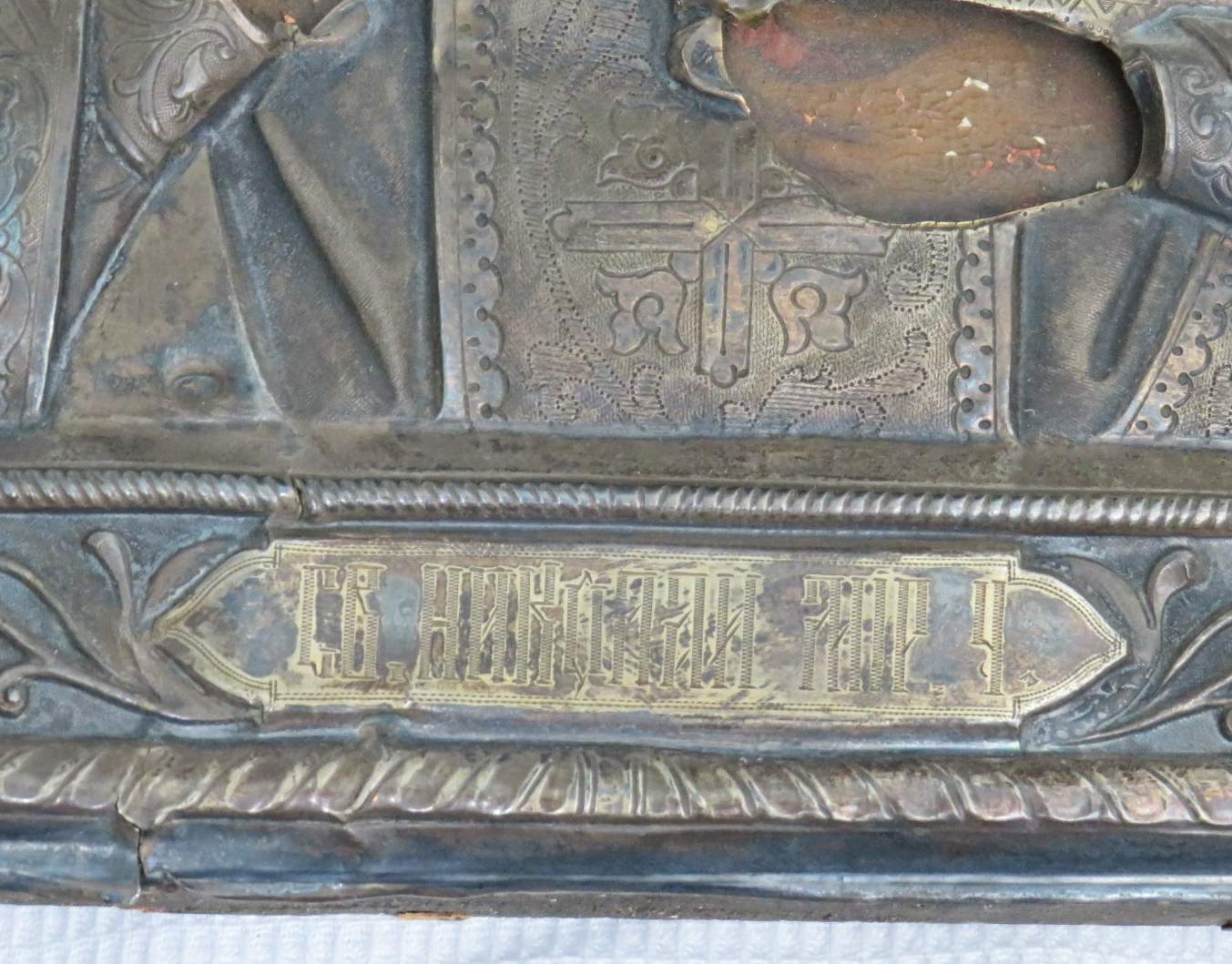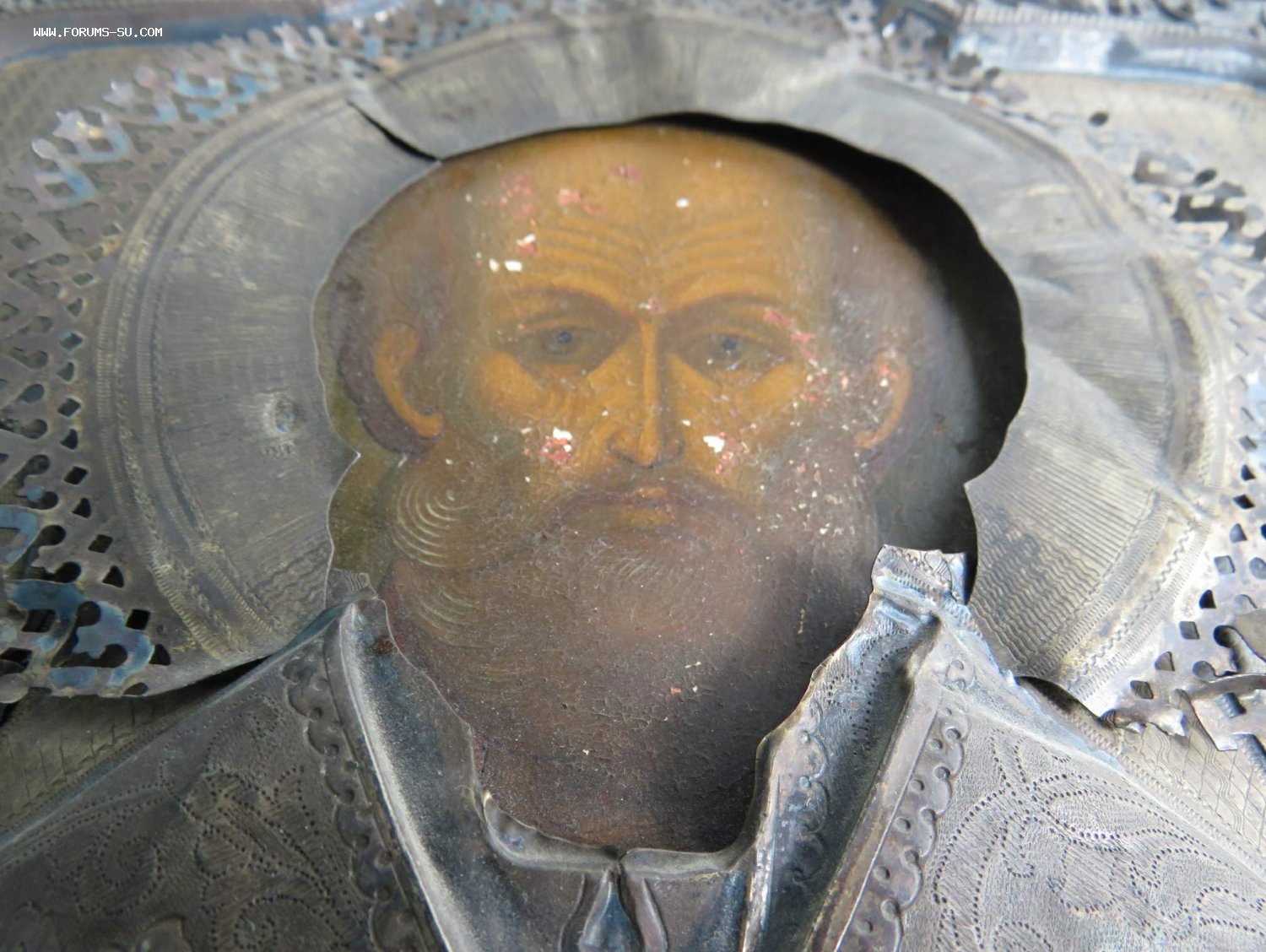 Большая икона в кованном серебряном окладе Николай Чудотворец 84 проба.