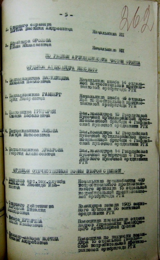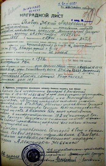 "В период боев с 13.01.45 по 26.02.45 года при ликвидации группировки немцев юго-западнее Кенигсберга,подполковник Ю.Гамберг обеспечил управление бригадой после гибели командира бригады взял командование на себя.