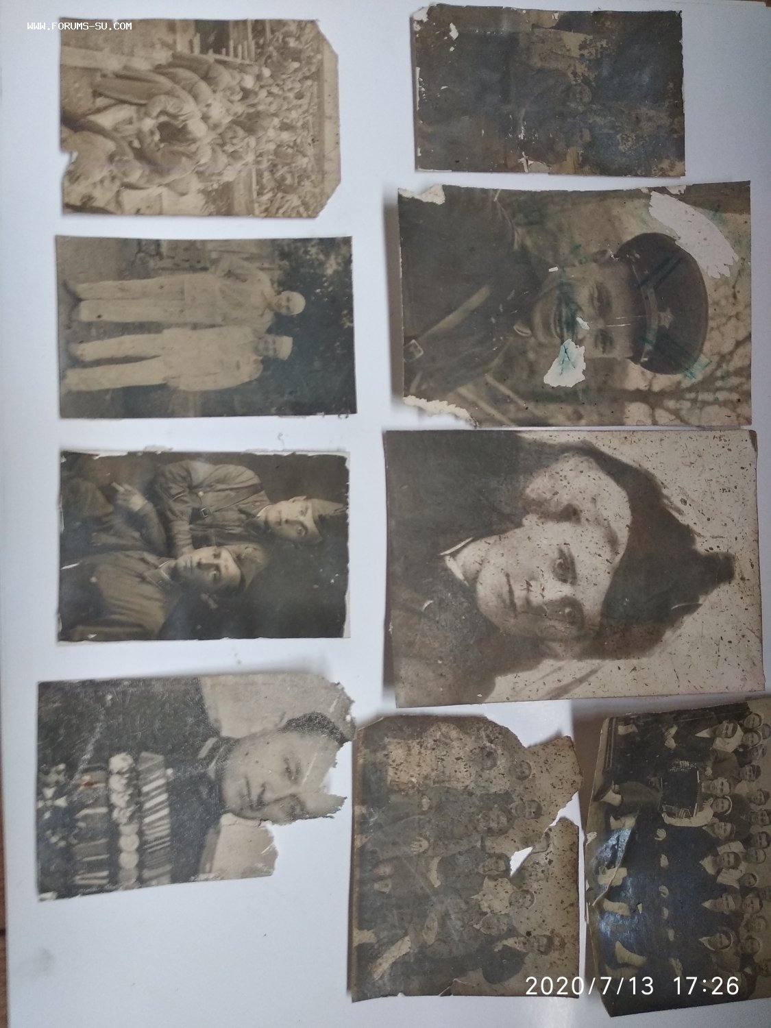 Времени особо не было, инструментов тоже, потому что мог- оторвал. Многие фото были просто выцветшие и от воды просто белые. Короче не судите строго- что мог, то спас. Сохран, конечно, так себе, но видно (есть и надписи на обороте). Короче по сохрану и цена!