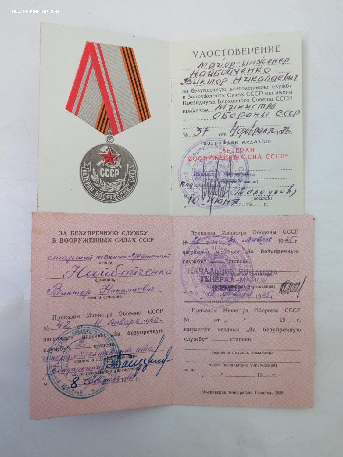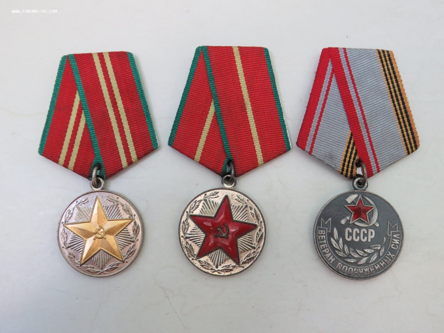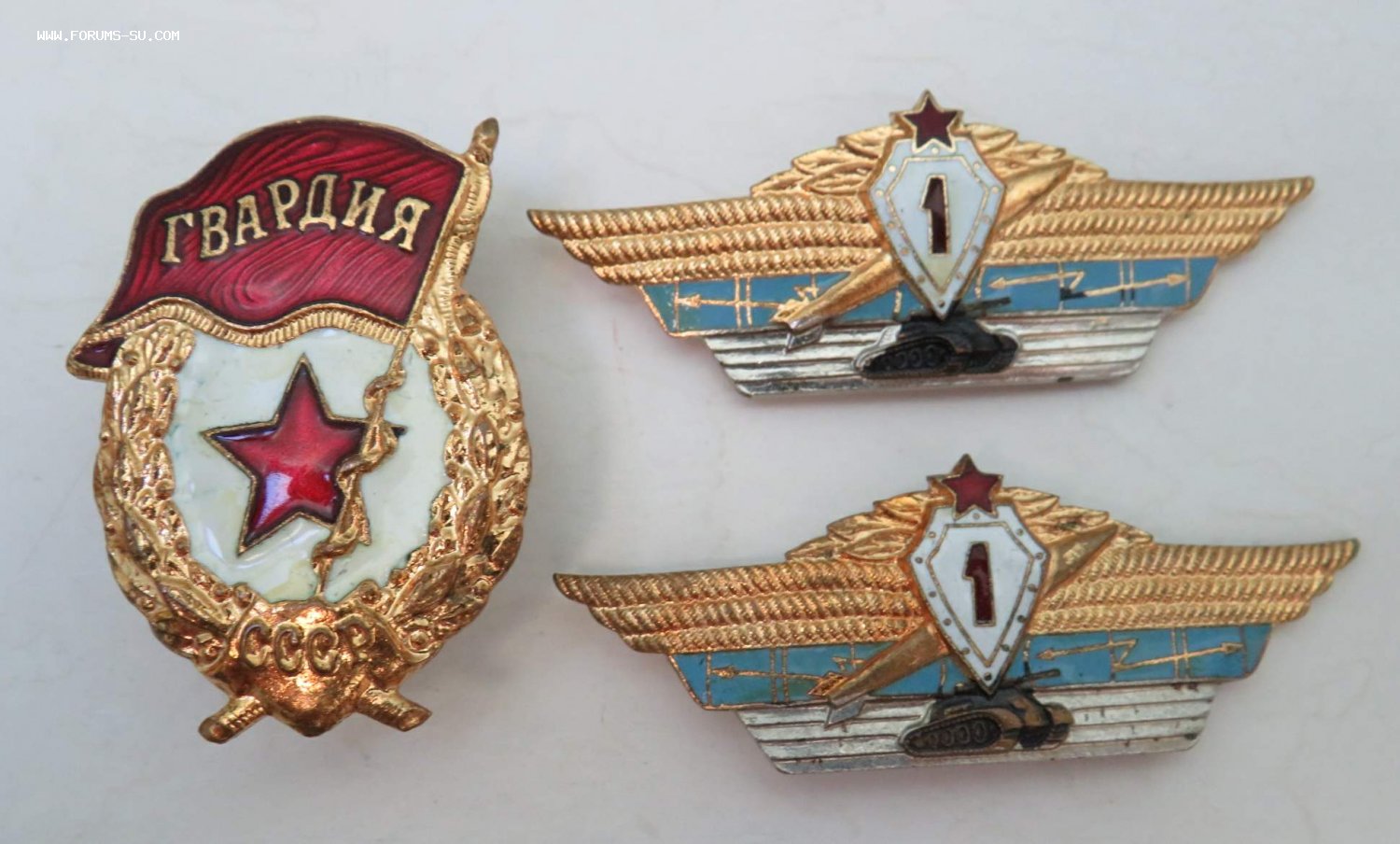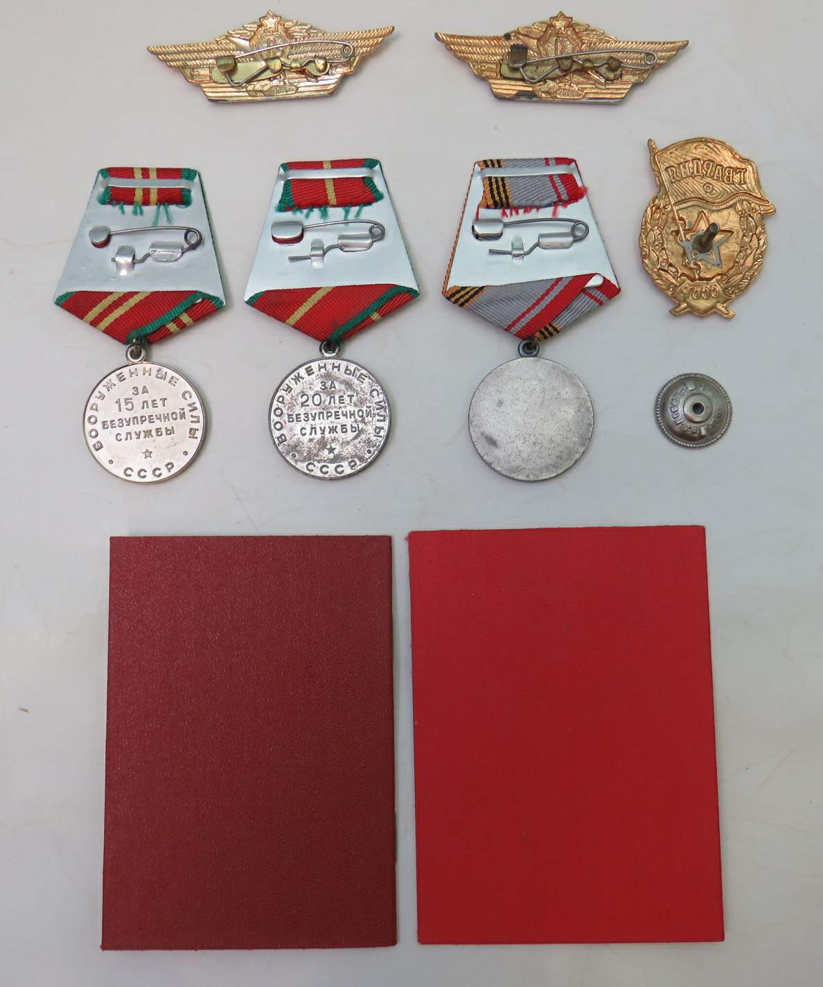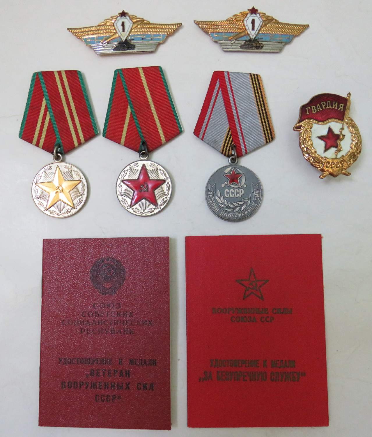 В лоте: 3 медали (15 лет безупречной службы ВС СССР, 20 лет безупречной службы ВС СССР, ветеран ВС СССР), 3 тяжелых знака (Гвардия, два знака танковой классности), 2 удостоверения к медалям. На одного человека.