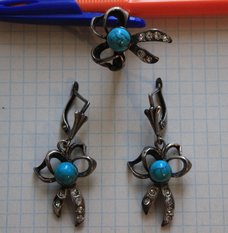 Комплект советского периода. Бирюза. Общий вес 18,88 гр. Кольцо (вес 7,23 гр., размер 19,5) и Серьги (вес 11,65 гр.). На каждом изделии клеймо ПЮМ. Серебрение.