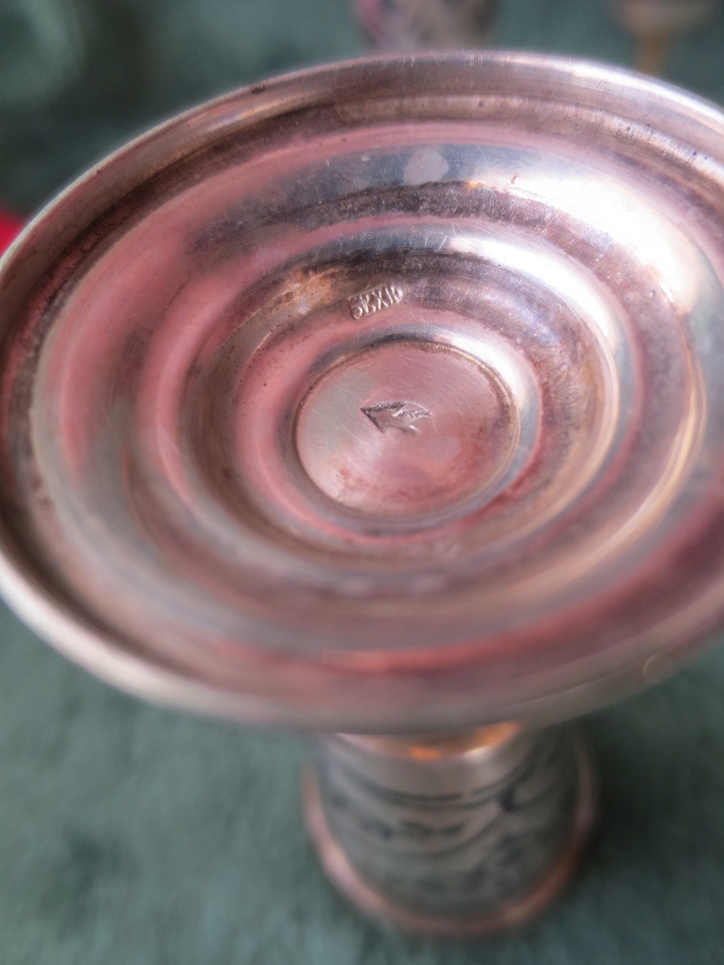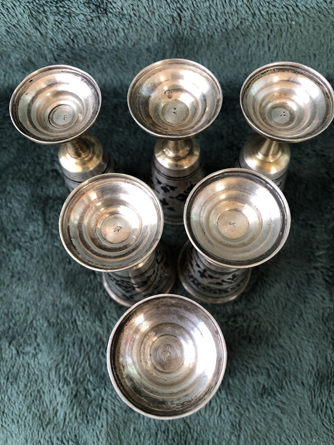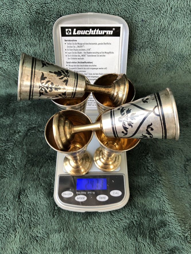 Общий вес всех 6-ти рюмок 243.3 гр. Высота рюмок 83 мм. Диаметр верхний 37 мм., диаметр "подошвы" 32 мм. Объём 25 мл.