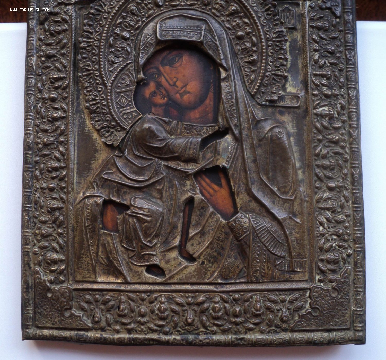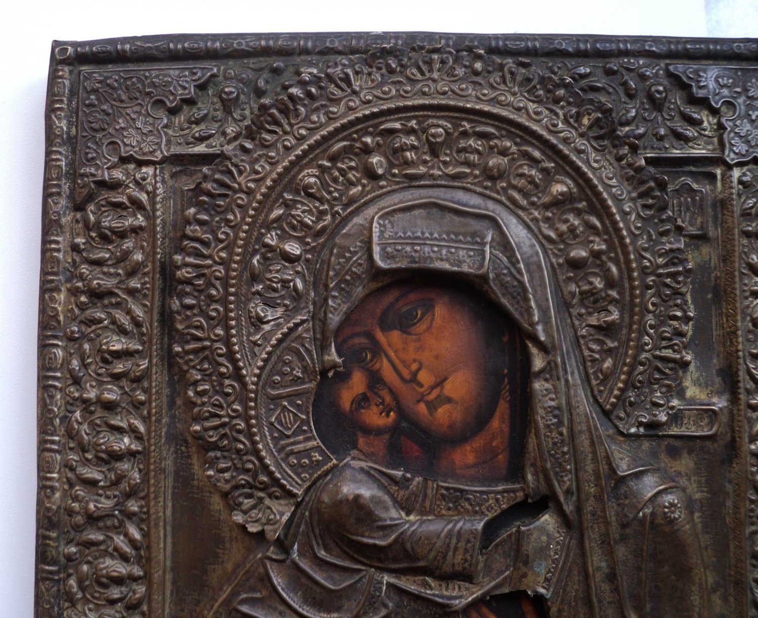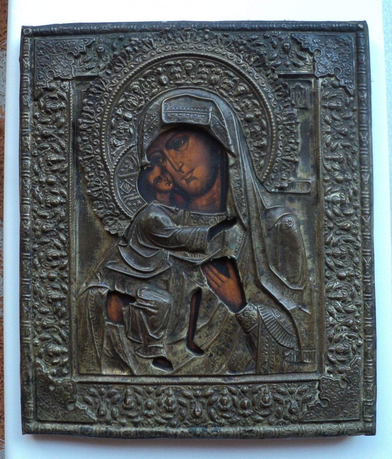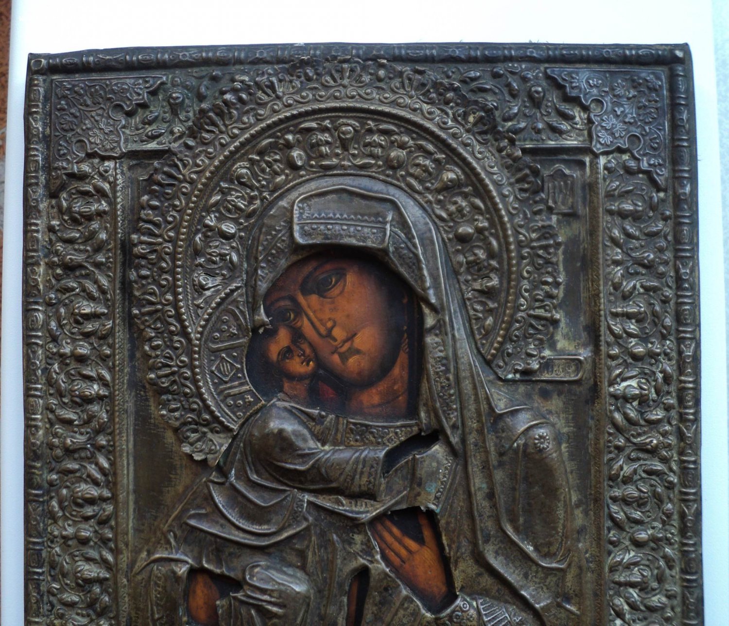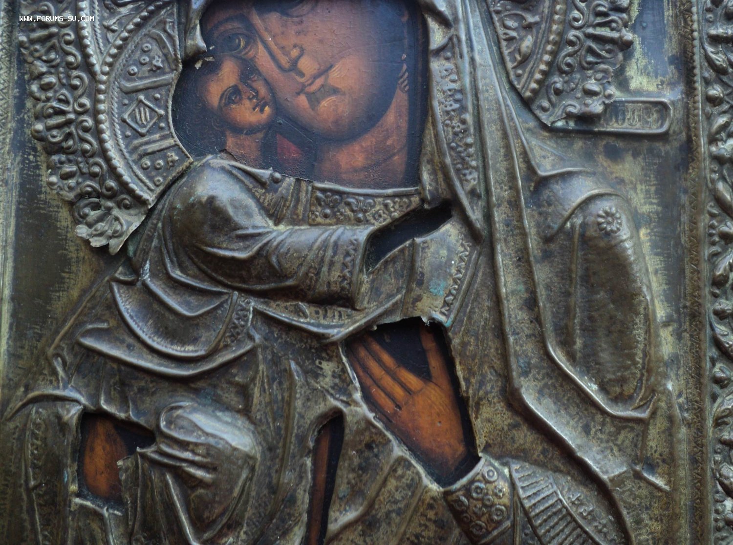 Следы бытования. Нет небольших перемычек оклада в районе рук Богородицы и перемычки между Богородицей и Иисусом.