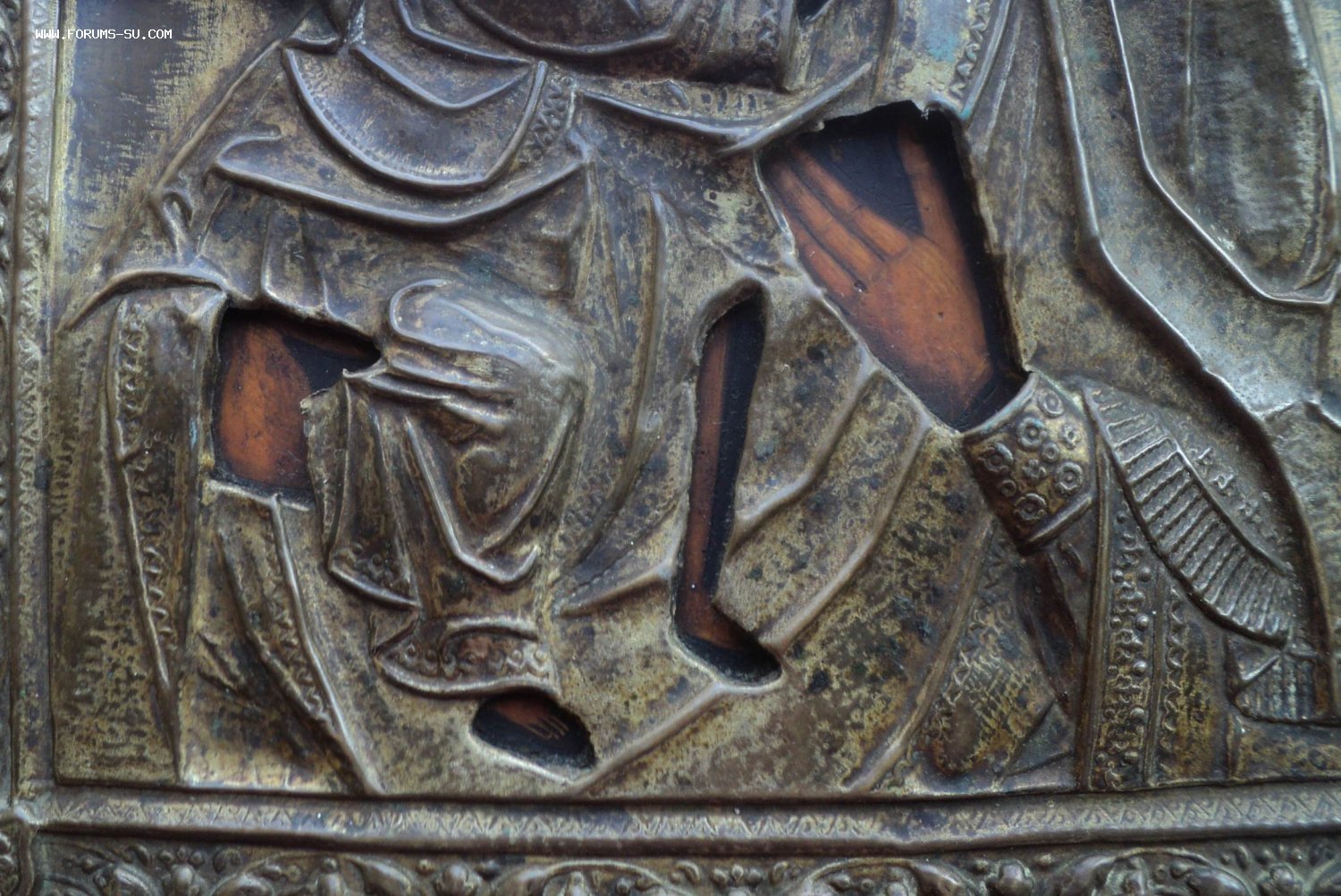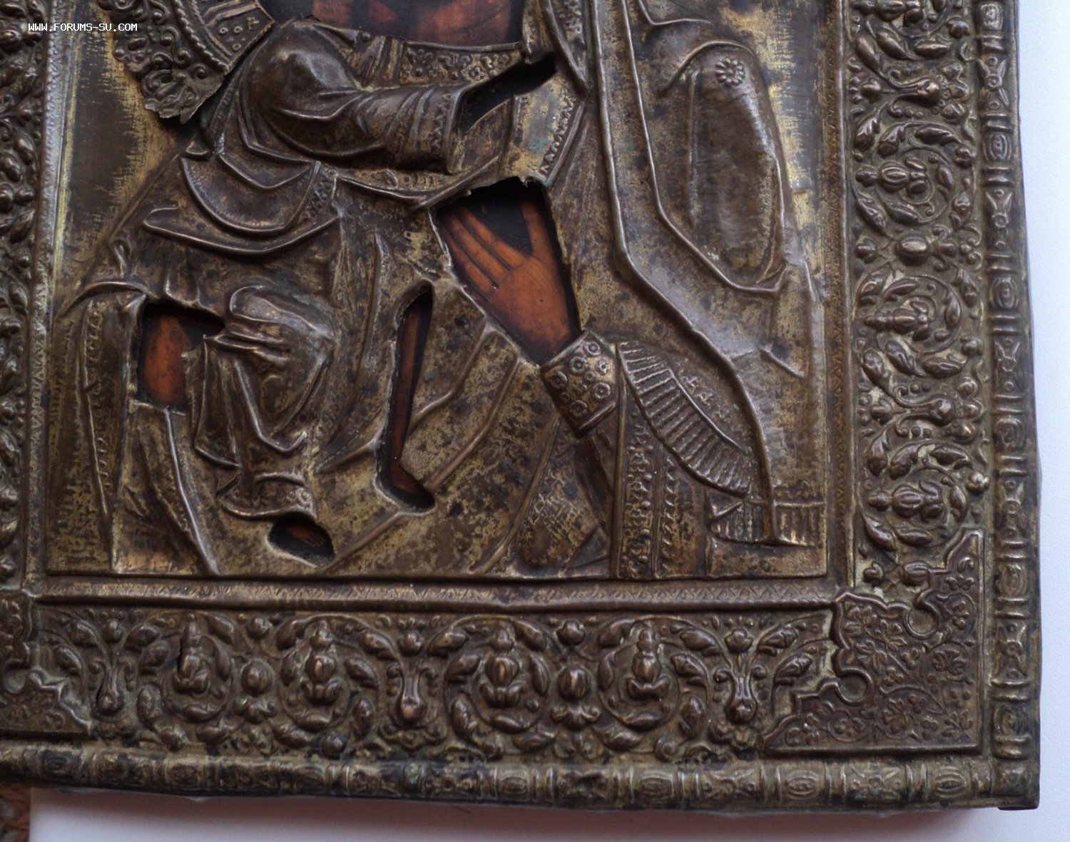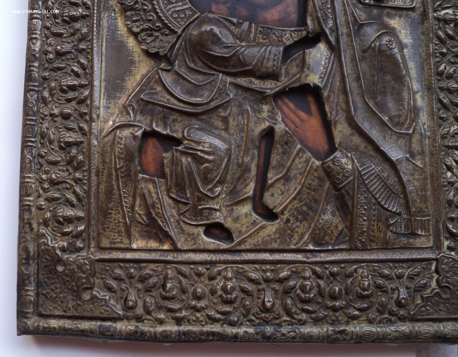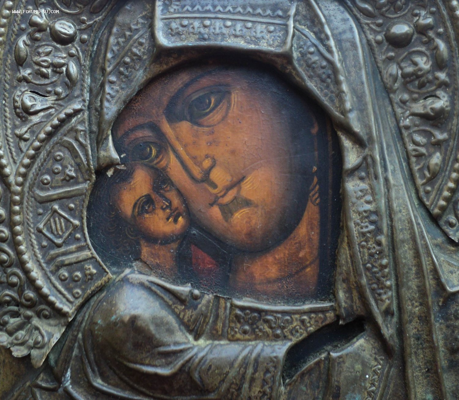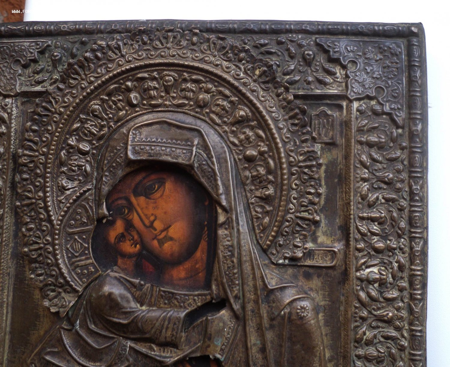 Следы бытования. Нет небольших перемычек оклада в районе рук Богородицы и перемычки между Богородицей и Иисусом.