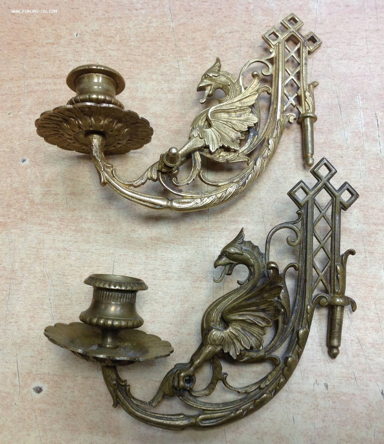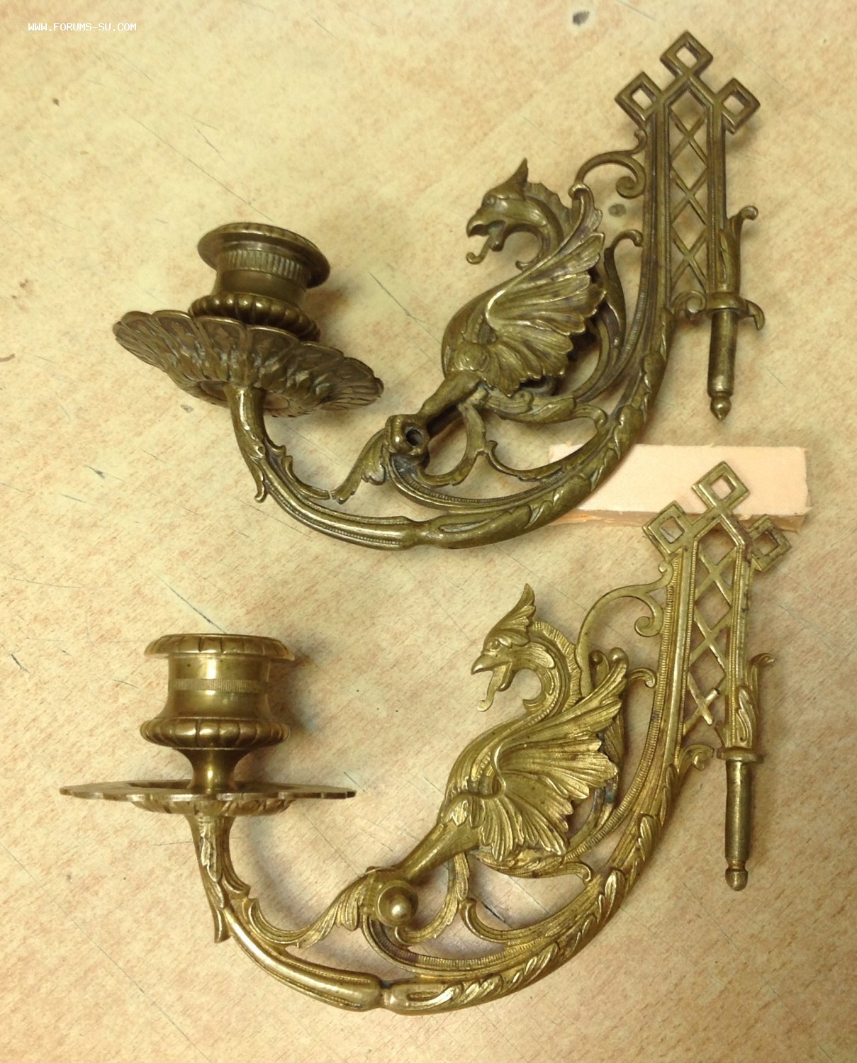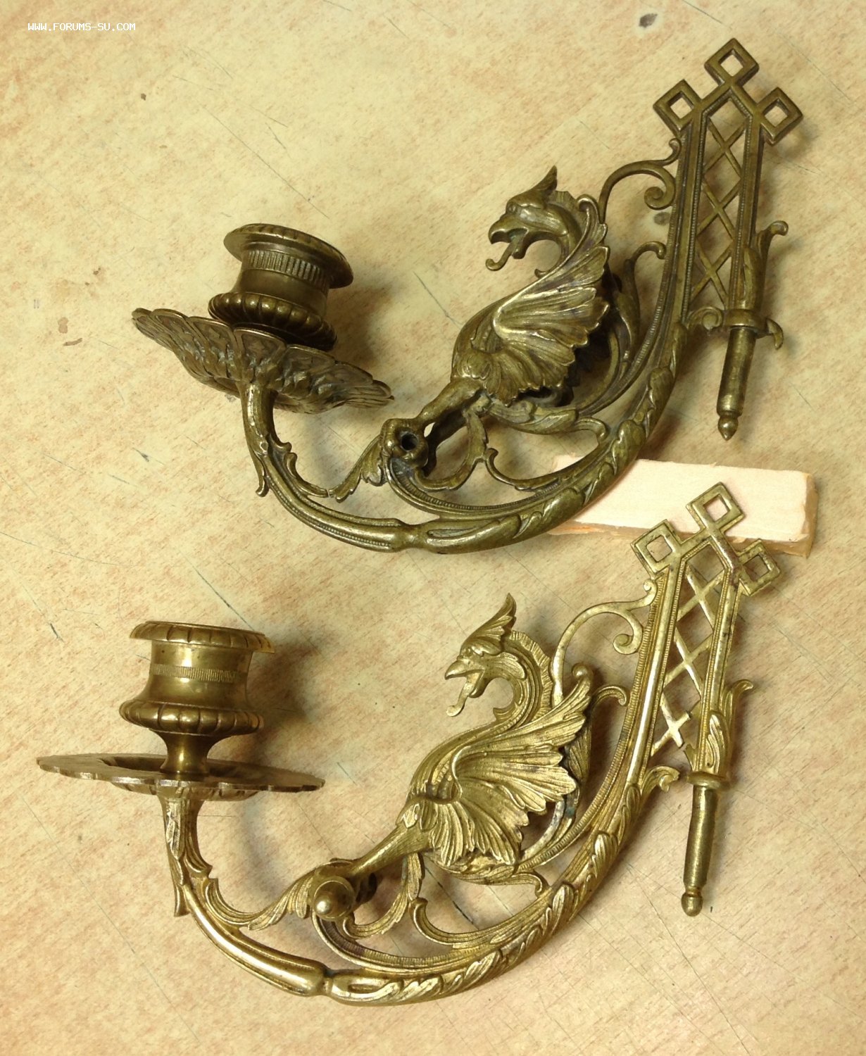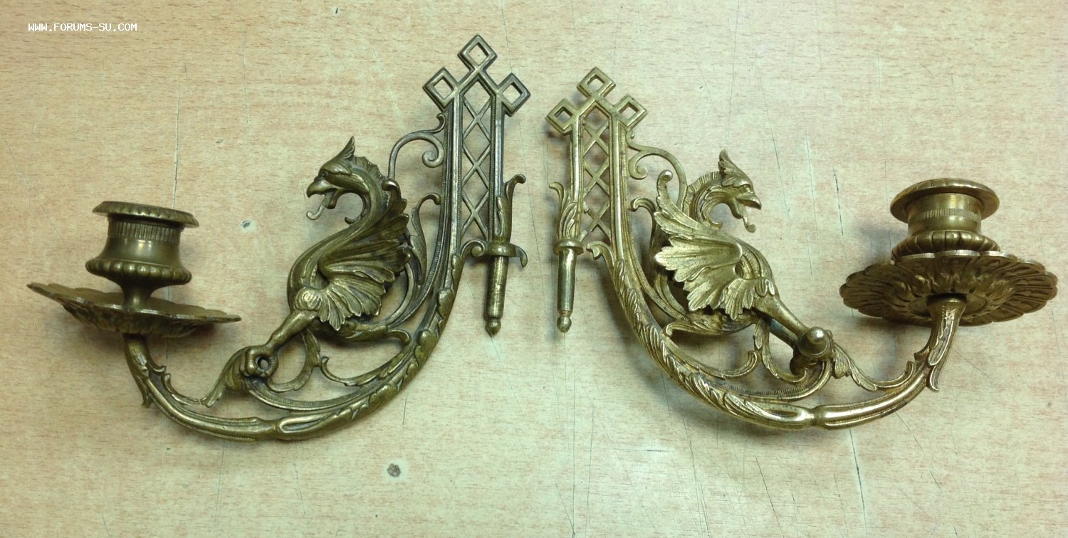 2 старинных подсвечника в виде Грифонов Moel - 21 сен 2020 14:55.32 × Мини профиль пользователя Moel Звание: Внимание! Кидала! Сообщения: 22748 Зарегистрирован: 31 авг 2005 21:49.38 Откуда: Россия Статус: Не в сети - 21 сен 2020 14:55.32 #6461198 Бронза . Габариты 18 см на 15 см. Сняты с одного пианино, но патина разная на них.. У одного в лапах нет перекладины. Следы бытования..Предложите по РФ! Фото