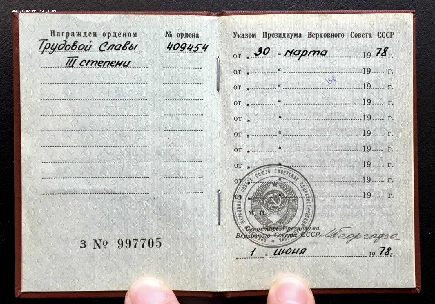 Лот состоит из ордена Трудовой славы на документе и двух Знаков Почета. На почетники доков нет. Состояние идеальное.