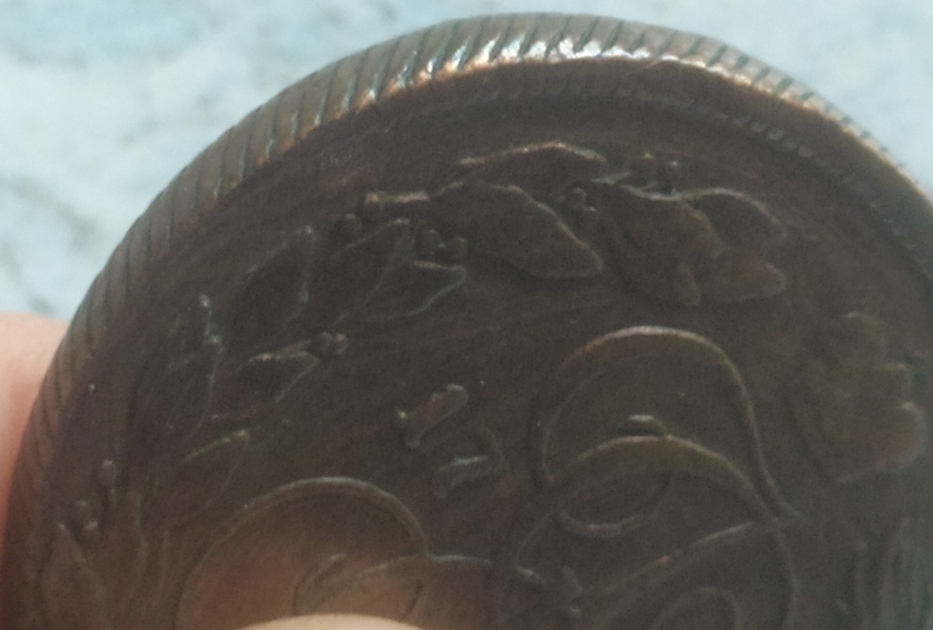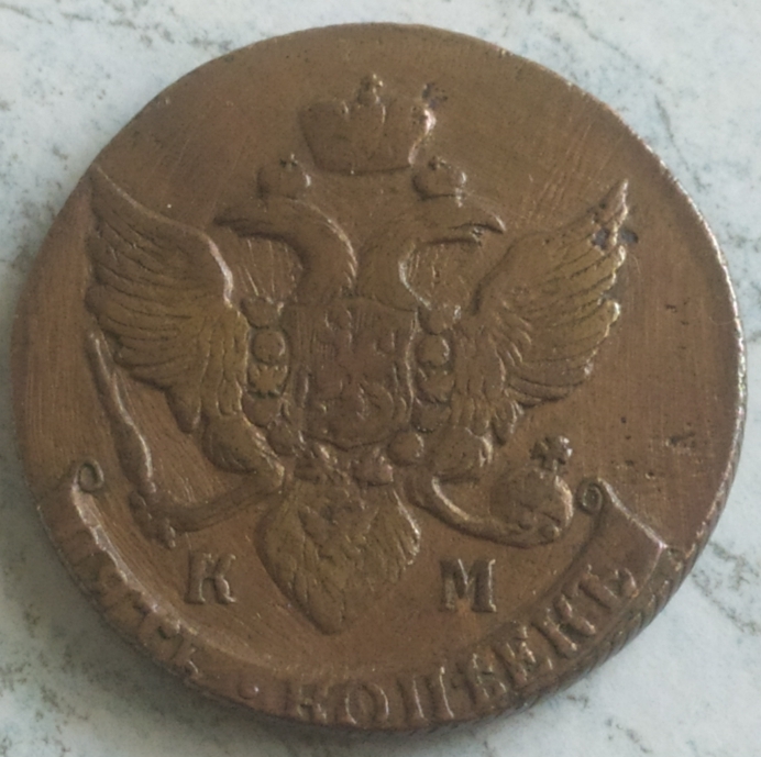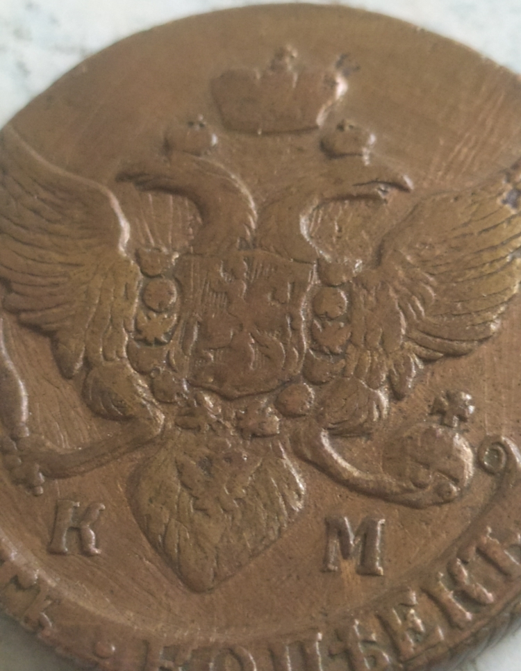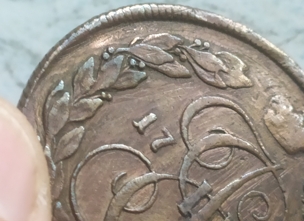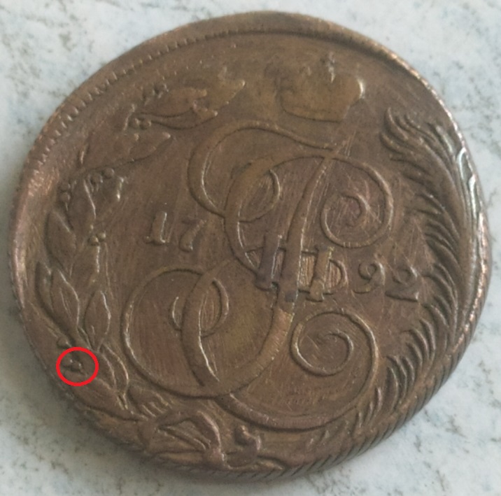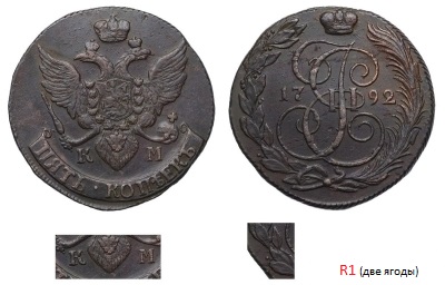 на КМ-их пятаках 1792 г., различимы 8 разновидностей , данный пятак самый дорогой по разновиду ; КМ Сузун - Аверс: Знак монетного двора больше. Реверс.: За вторым звеном от банта лавровой вет- ви две ягоды, степень встречаемости R1