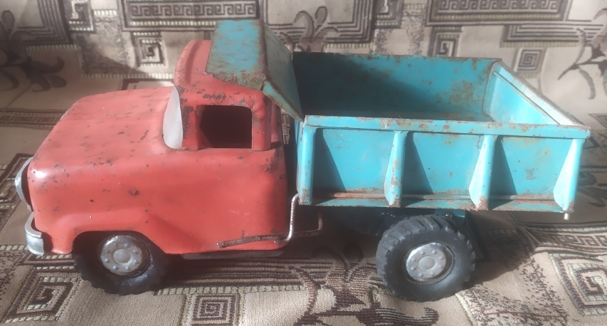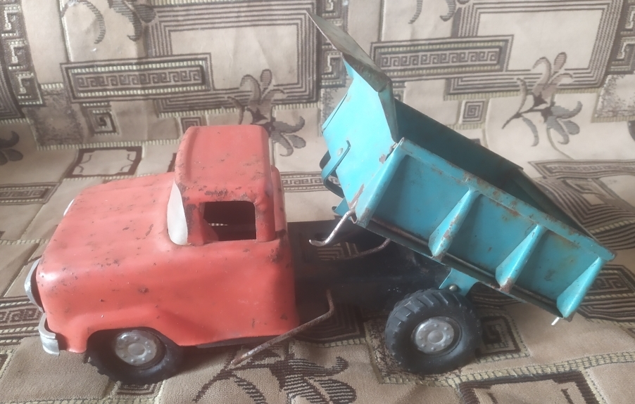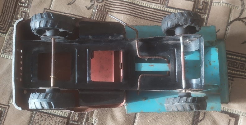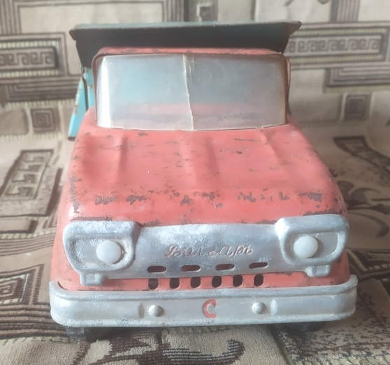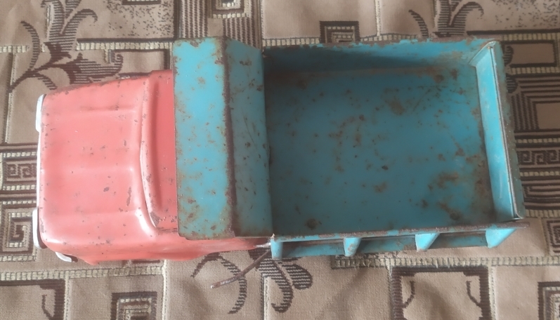 механизмы все в рабочем состоянии, хорошо поднимается кузов и открывается крышка, всё рычагами конечно, лопнуто только лобовое пластм. стекло, алюминиевые детали , колпаки на колёсах , накладка капота и бампер в очень хорошем состоянии, резина