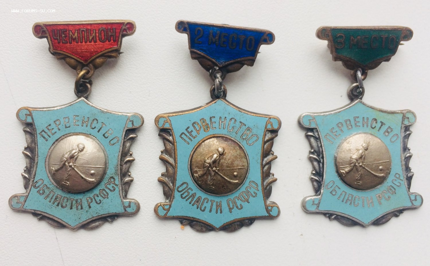 Комплект значков 1,2 , 3 место Первенство области РСФСР по хоккею с мячом. Почту оплачивает покупатель.