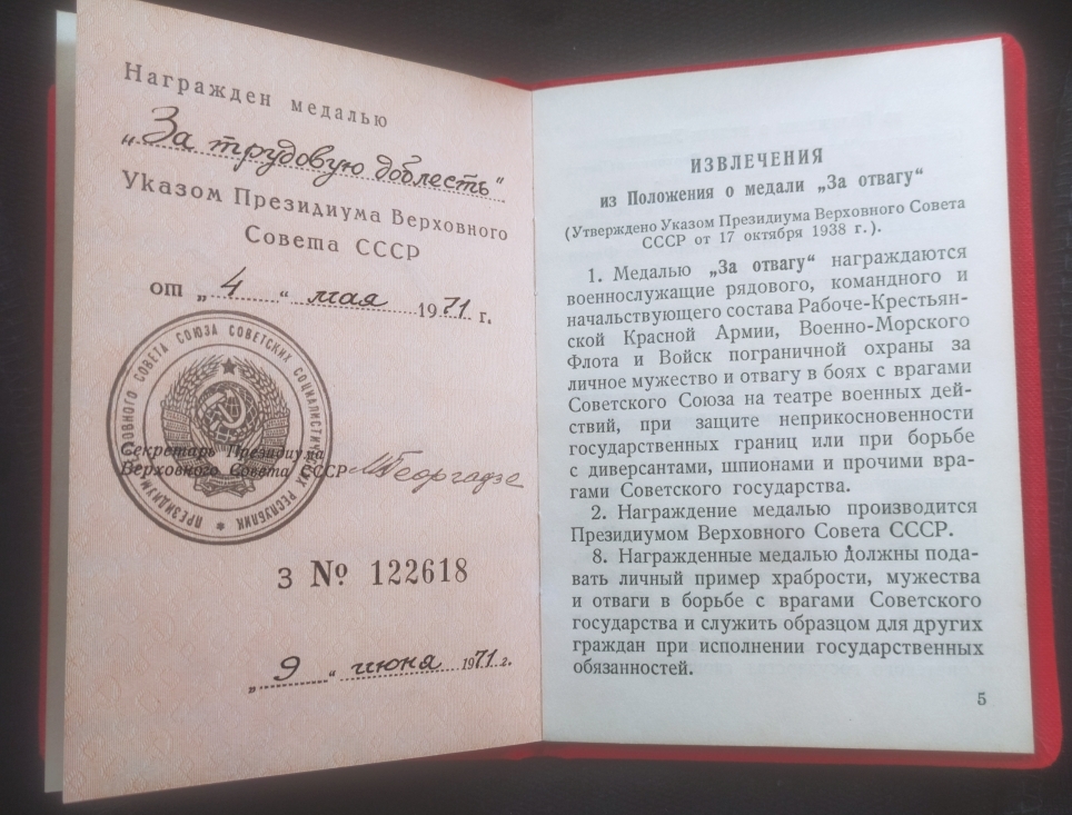Медаль и документ без утрат, замен и вмешательств , всё родное в хорошей сохранности с боевого и трудового комплекта наград Кавалера-фронтовика орденоносца молодого , тема тут была ; viewtopic.php?t=815337