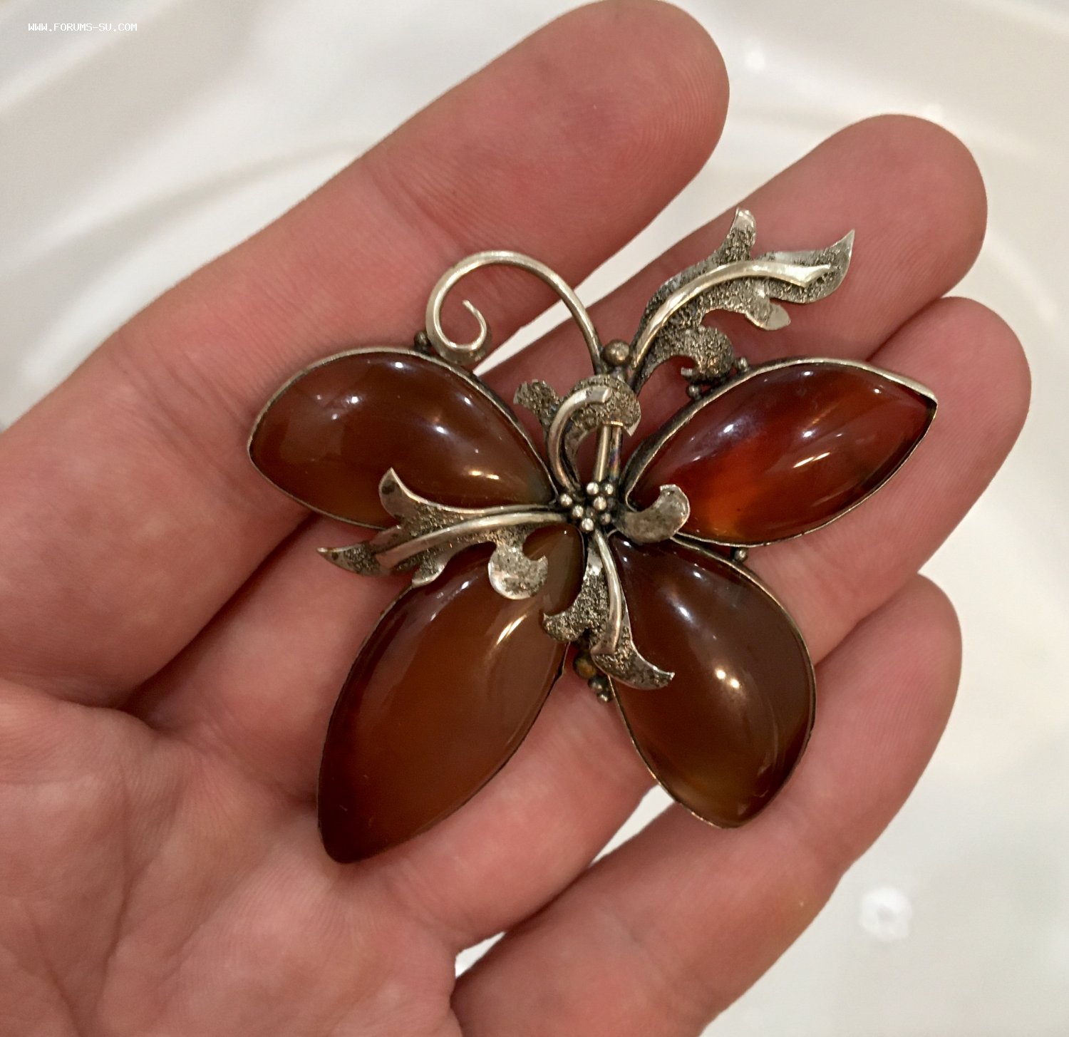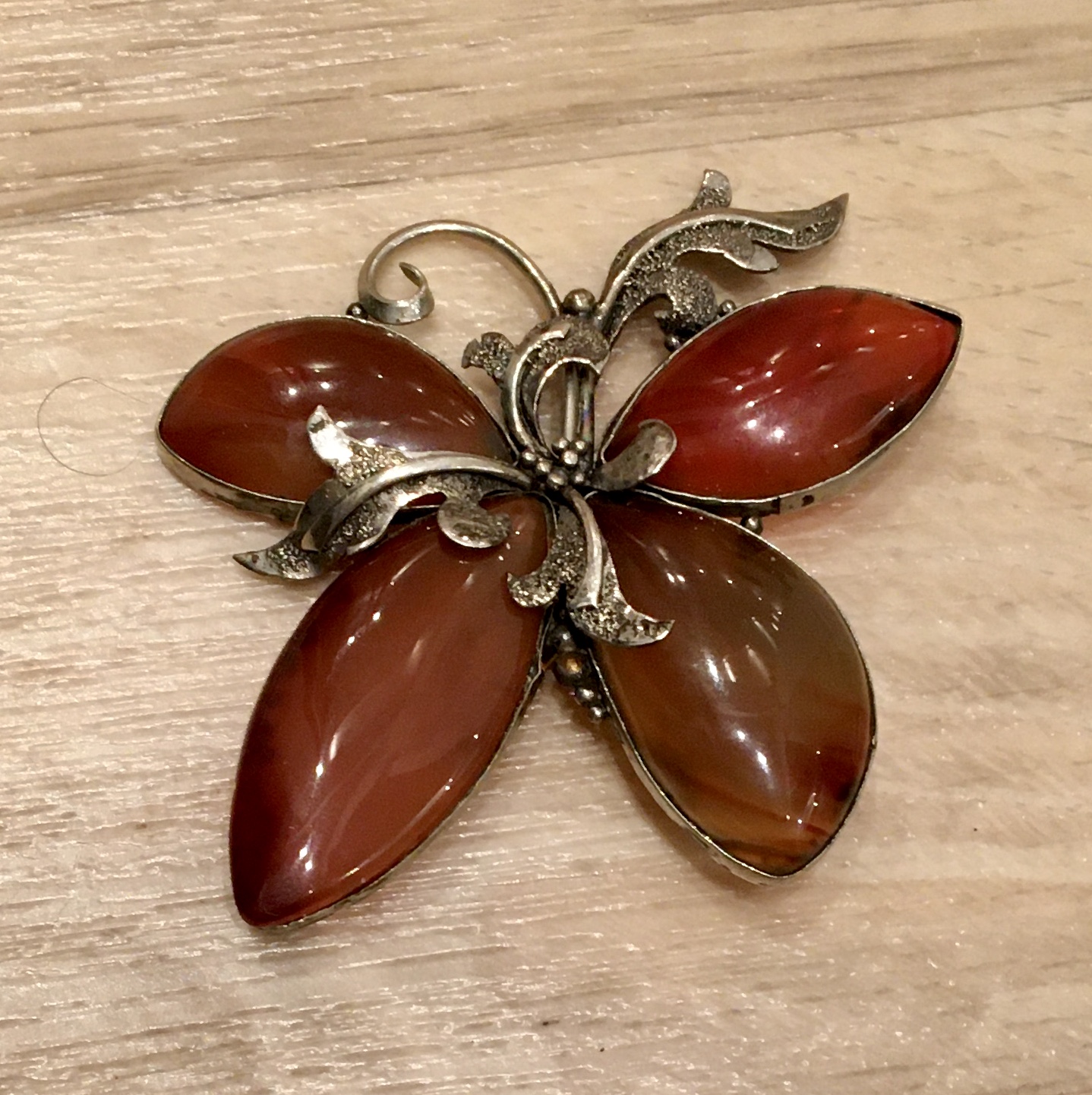 Брошь изумительной ювелирной работы. Что за металл не знаю. Камни-вставки похожи на сердолик. Бабочка большого размера (см. фото с линейкой), ширина около 6 см.