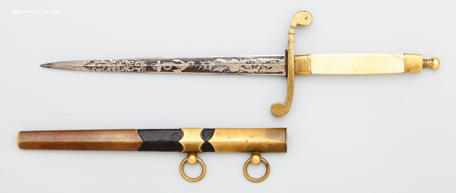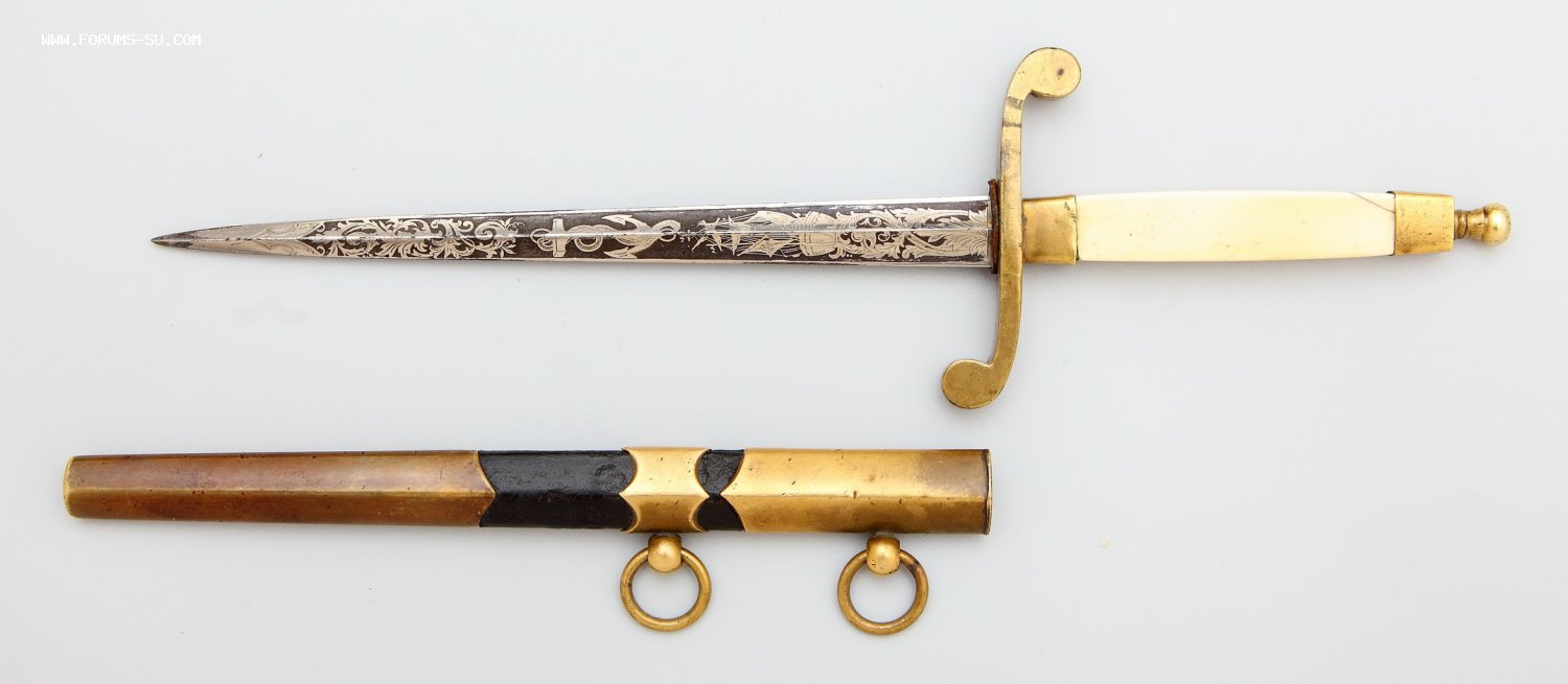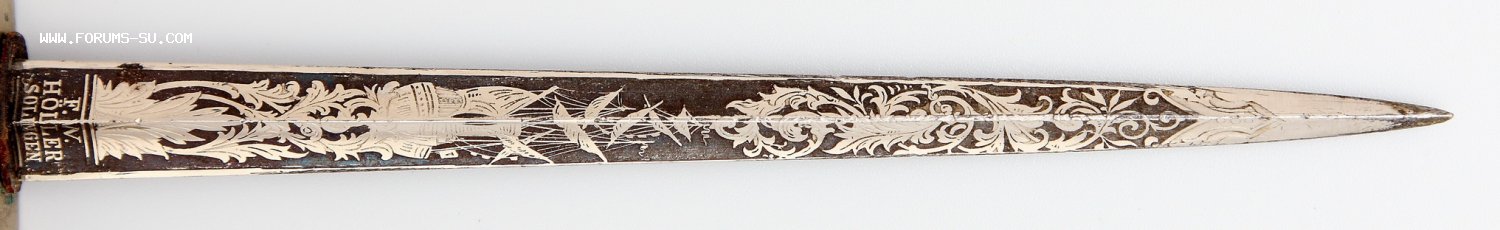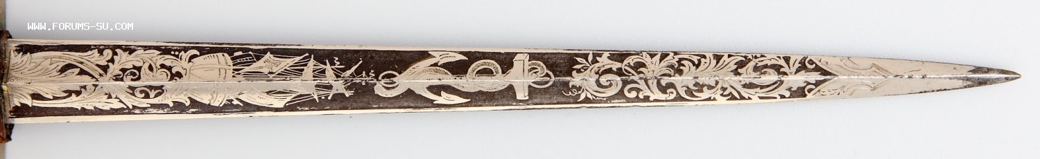 Шикарный офицерский морской кортик с клинком в травлении. Клин весь в травлении на темно-синем поле (сейчас смотрится черным). Общая длина 317мм, длина клинка 188мм, ширина клинка у основания 16мм.