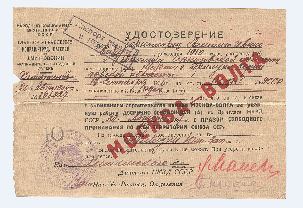 Документ: Удостоверение дано гр. Черноморец Василию Ивановичу г. Прилуки, Черниговской обл. Осужденному 17 сентября 1930 года по ст. 116, 97 ч I УССР на один год.