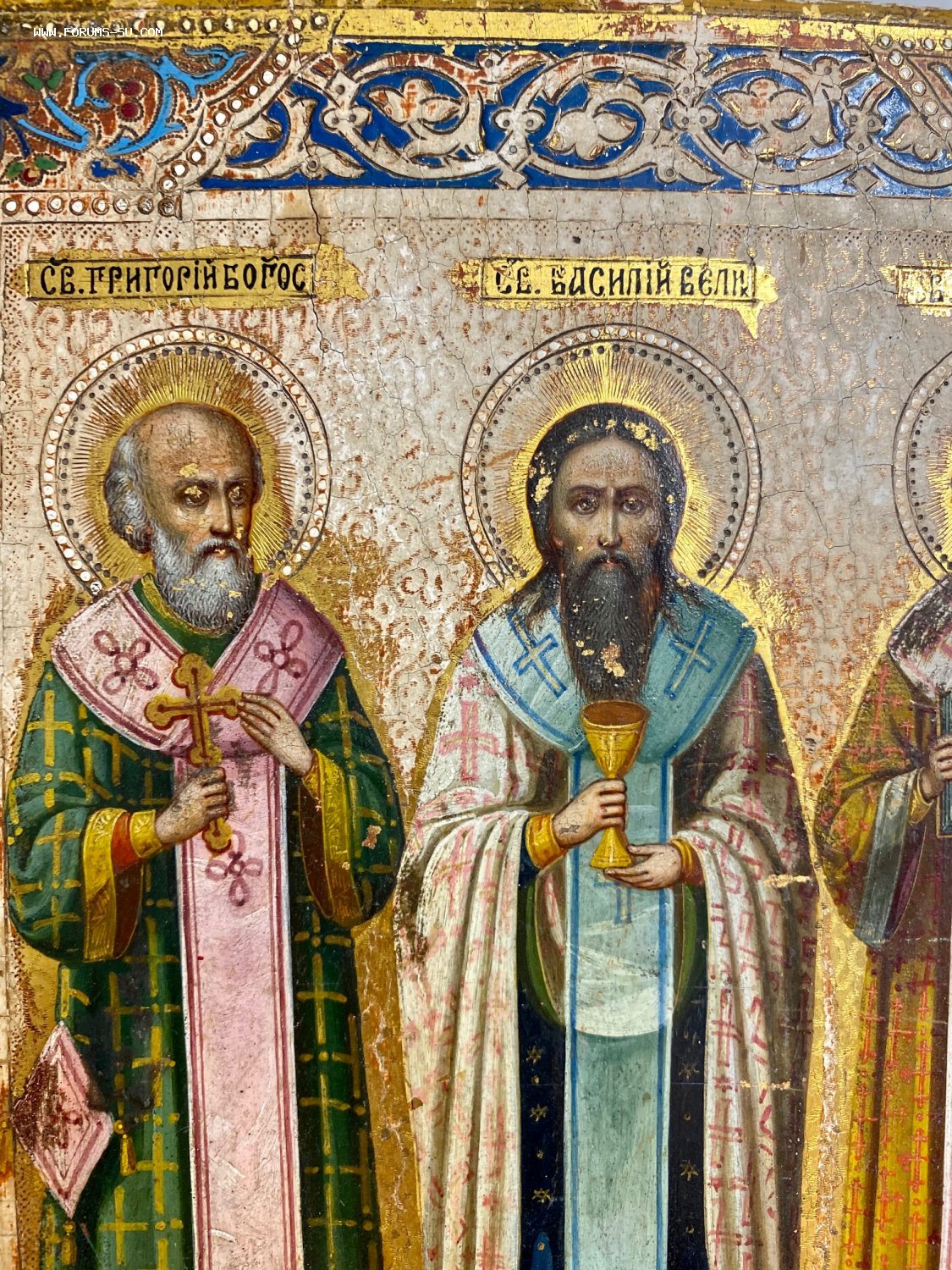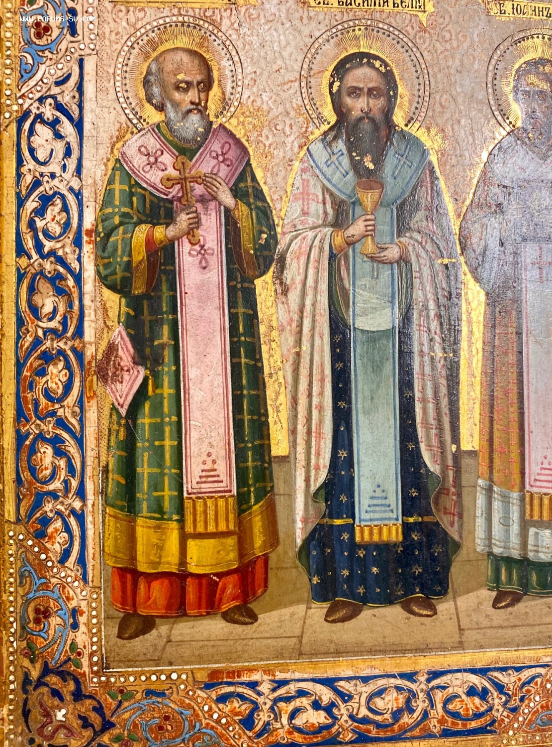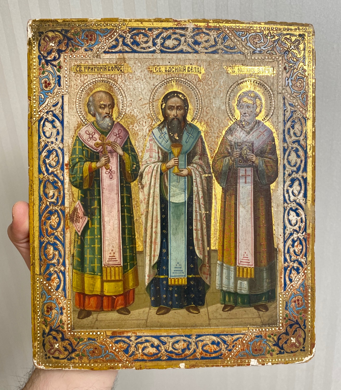 Икона избранные святые - Григорий Богослов, Василий Великий, Иоанн Златоуст. Сусалка. По золоту. Академическое письмо.