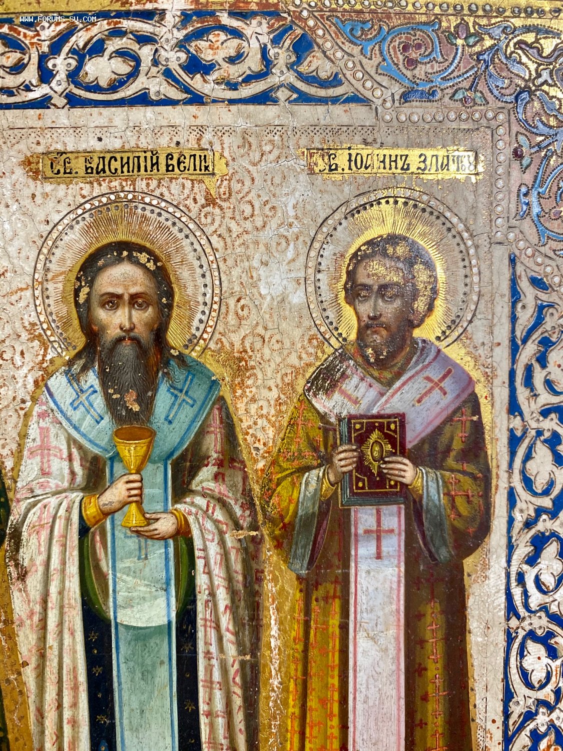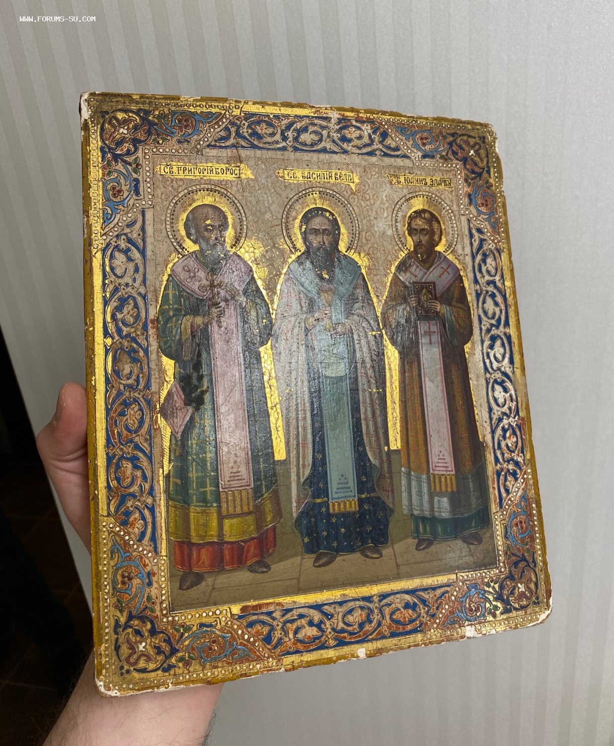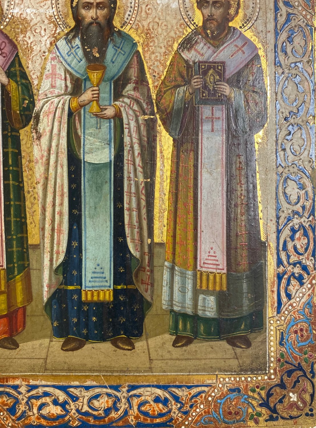 Икона избранные святые - Григорий Богослов, Василий Великий, Иоанн Златоуст. Сусалка. По золоту. Академическое письмо.