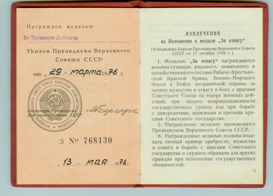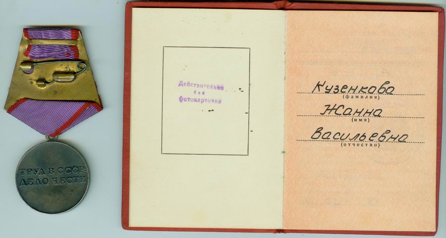 Медали Серп и Молот, За Трудовую Доблесть, За Трудовое Отличие, За Доблестный Труд в Великой Отечественной Войне,За Восстановление Предприятий Чёрной Металлургии Юга, За Восстановление Угольных Шахт Донбасса, За Освоение Целинных Земель, За Строительство БАМ, За Преобразование Нечерноземья РСФСР, За Освоение Недр и Развитие Нефтегазового Комплекса Западной Сибири, Ветеран Труда