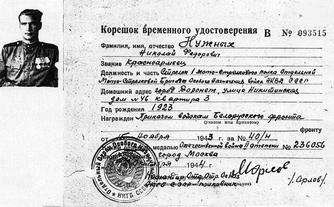 Фото разведчика-диверсанта рядового Нужных Н.Ф. Фото заверено, размер 4х5см.