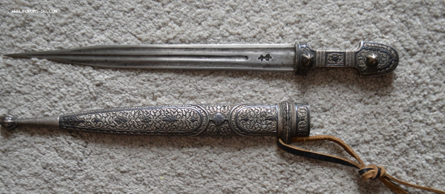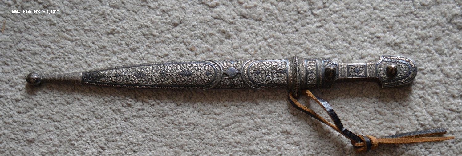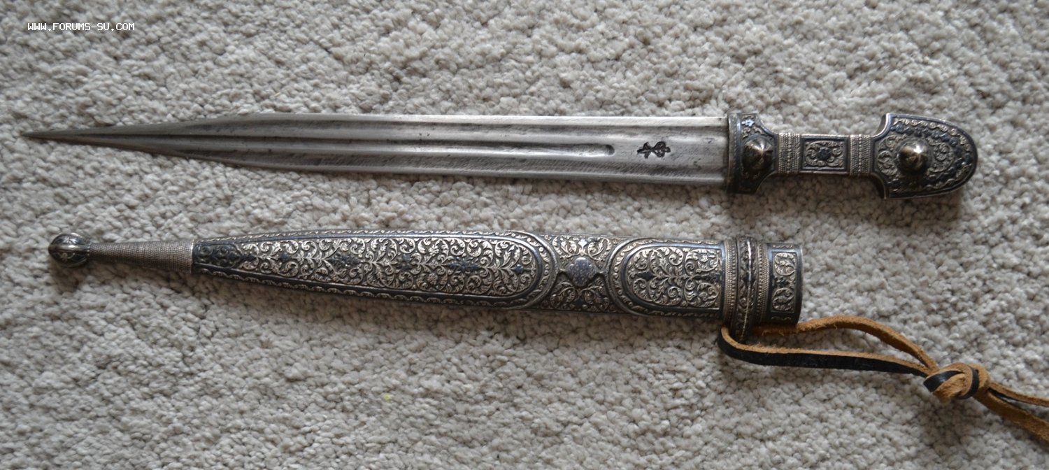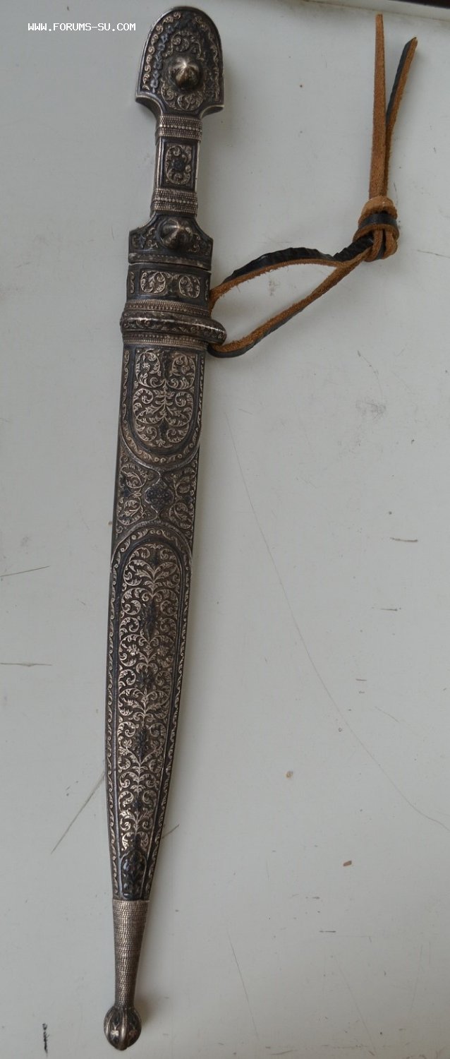 КИНЖАЛ КАВКАЗСКИЙ СЕРЕБРО 84пр. , клейма мастера и проба 84 до 1908 года на ножнах и рукояти. Длина общая-45 см, длина клинка-32 см.