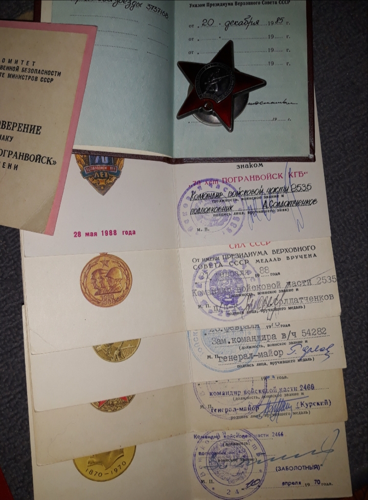 Являясь советником командира воинской части погранвойск Демократической Республики Афганистан, майор принимал непосредственное участие в планировании, подготовке и проведении успешных боевых операций. Силами этой воинской части были ликвидированы две группировки душманов. Какое -то время работал в посольстве. Знаки в люксе. ( кроме значка отличный пограничник 2ст. Немного покоцан)