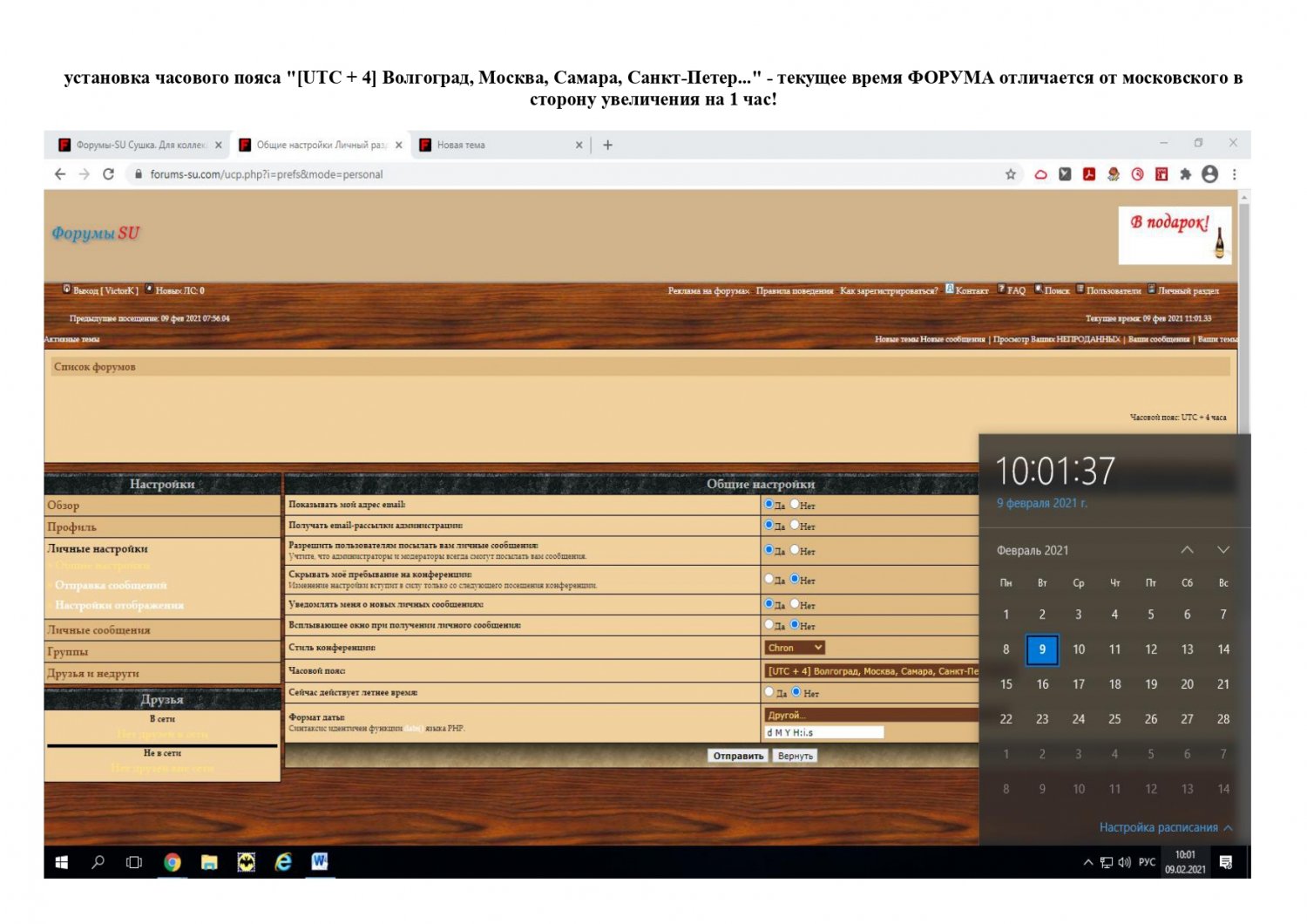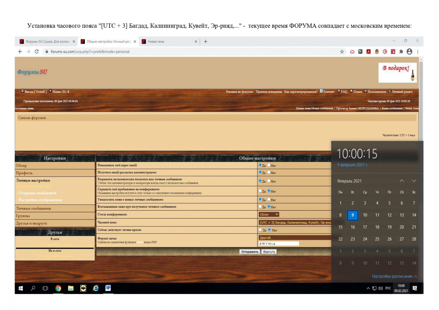 - при установке часового пояса "[UTC + 3] Багдад, Калининград, Кувейт, Эр-рияд,...", то текущее время ФОРУМА совпадает с московским временем.