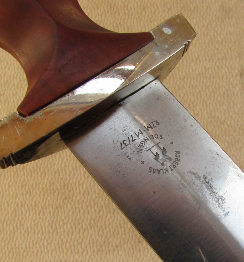 на переходном (транзитном) штурмовом кинжале не должно быть (гау) на гарде.(гарды не от него).Гарды в тяжёлом металле..А приборы ножен нет.(если они в цинке).Если ножны тоже в тяж мете,,тогда клинок не в тему...