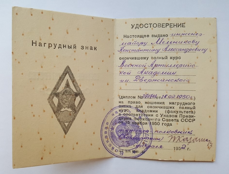 Удостоверение к ромбу Военной Артиллерийской Академии им. Дзержинского.