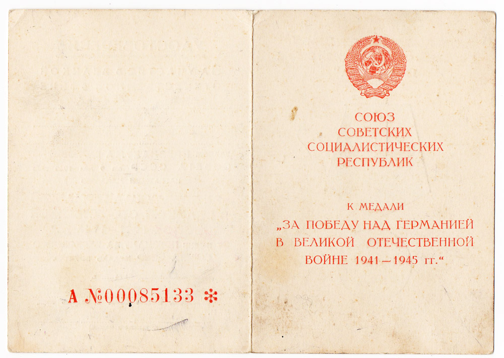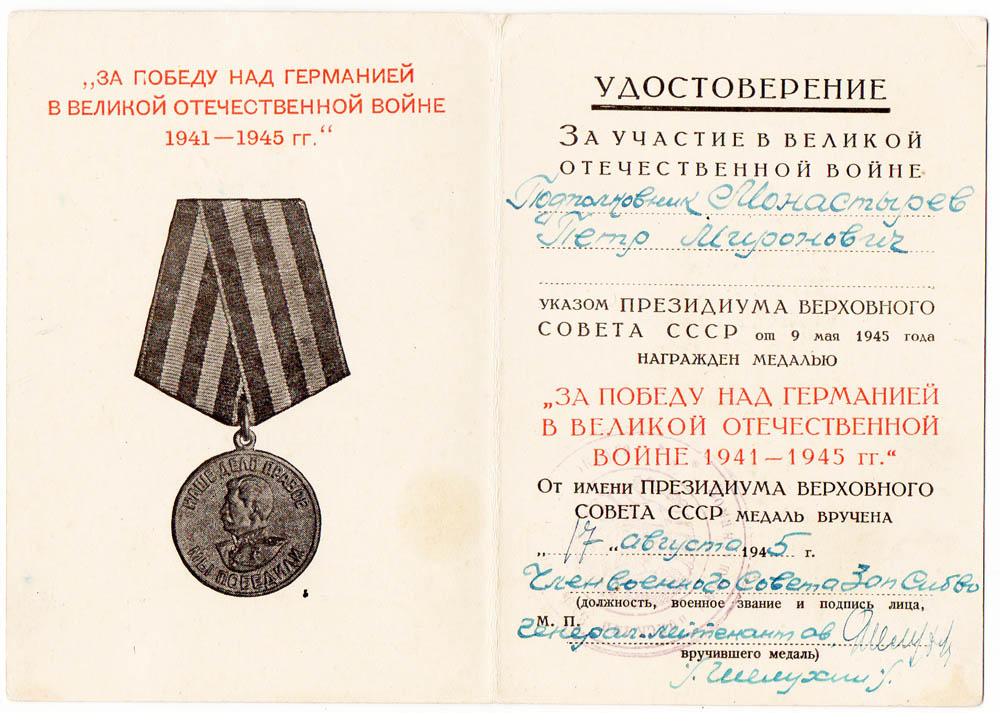 [b]Удостоверение к медали "За победу над Германией в ВОВ 1941 - 1945 гг." Подпись генерал - лейтенанта.