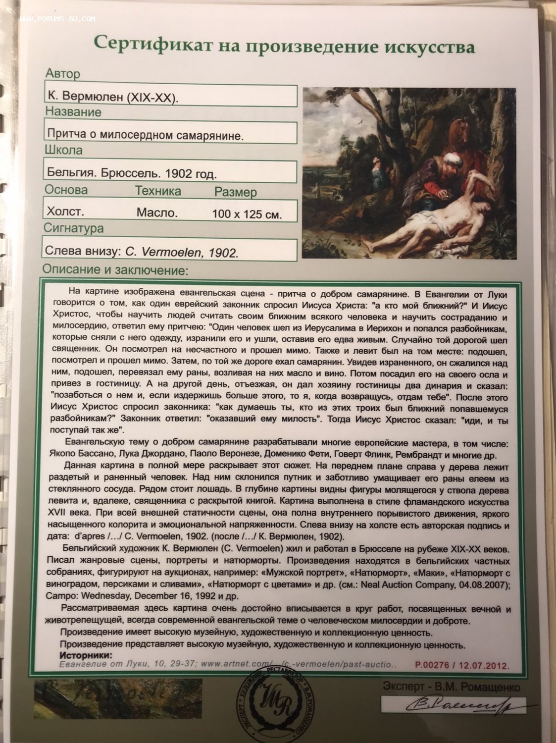 «Самарянин» худ. С. Vermoelen 1902 г. Kasper - 08 апр 2021 21:37.12 × Мини профиль пользователя Kasper Сообщения: 631 Зарегистрирован: 22 май 2017 01:02.41 Статус: Не в сети - 08 апр 2021 21:37.12 #6517320 Очень большая и красивая работа бельгийского художника C. Vermoelen 1902 года. «Притча о милосердном самарянине» Общий размер 153х129 см. По подрамнику 100х125 см. Фото