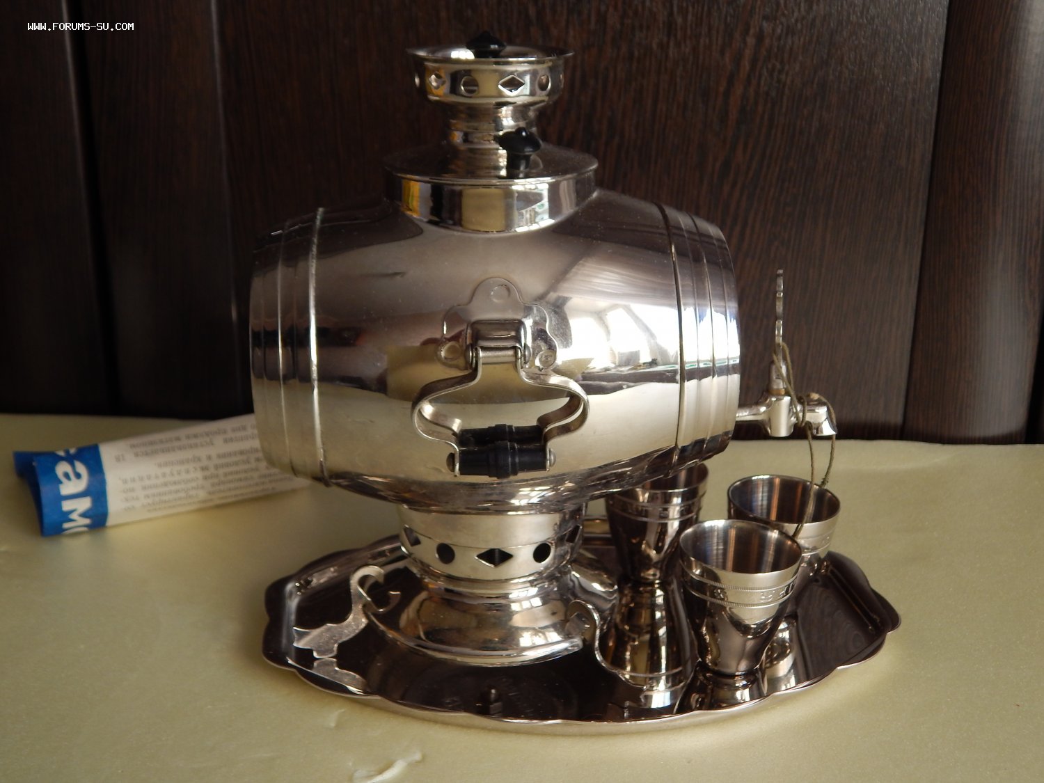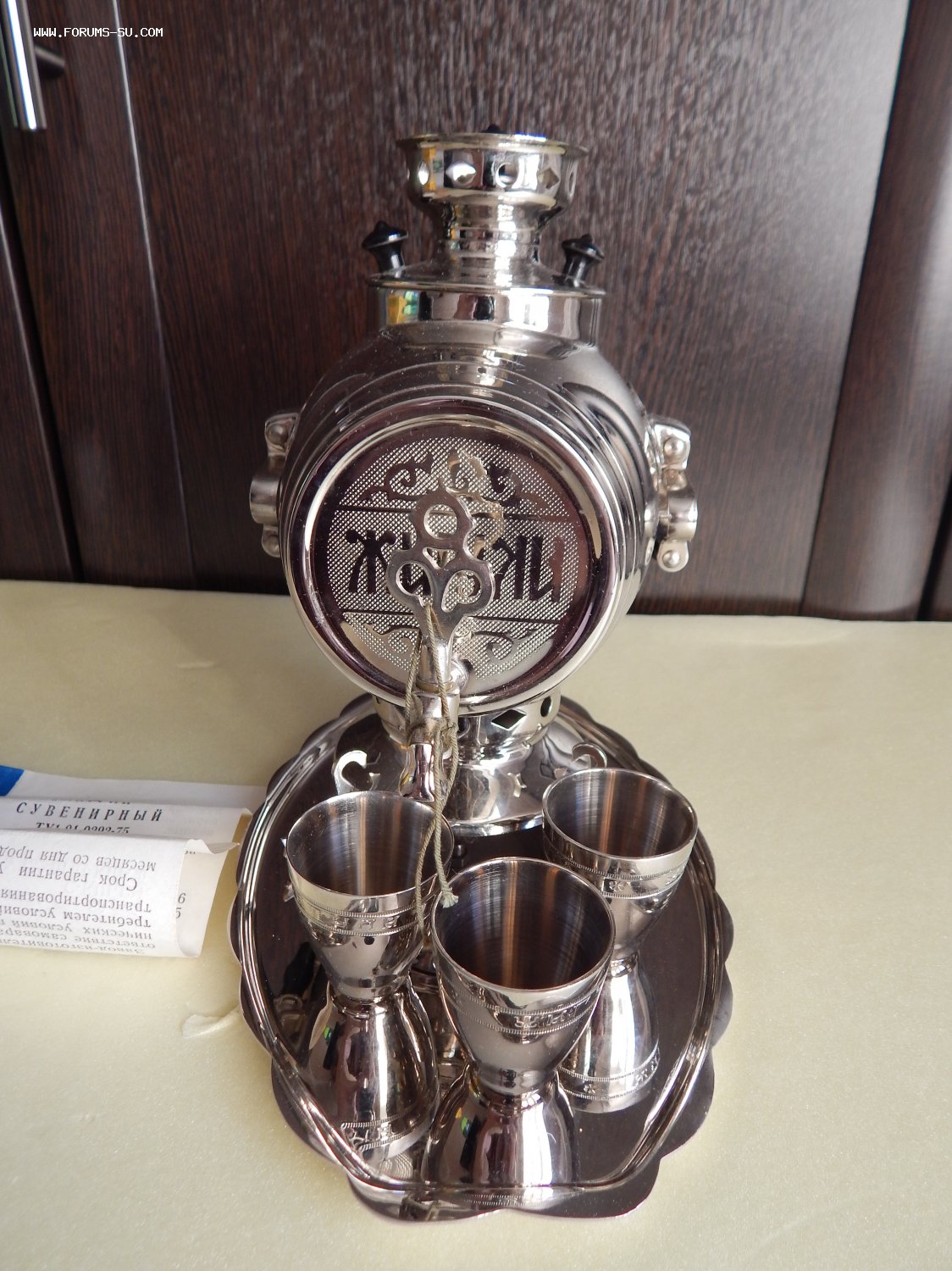 Сувенирный комплект: самовар-бочка Жигули. три стопки и поднос. Латунь, никелирование, пластмасса