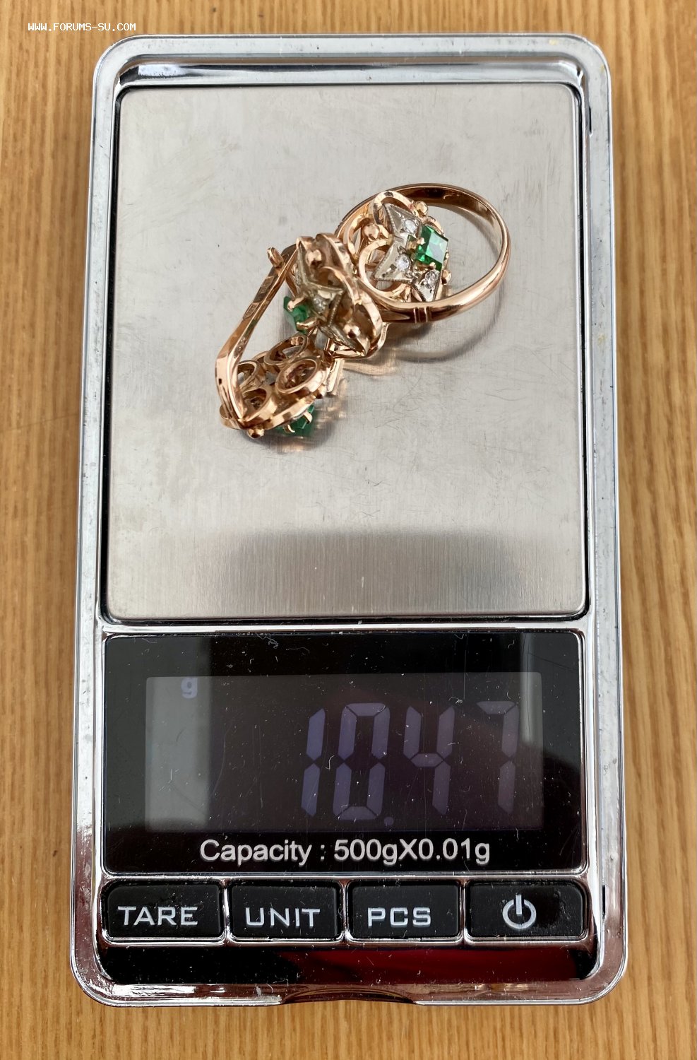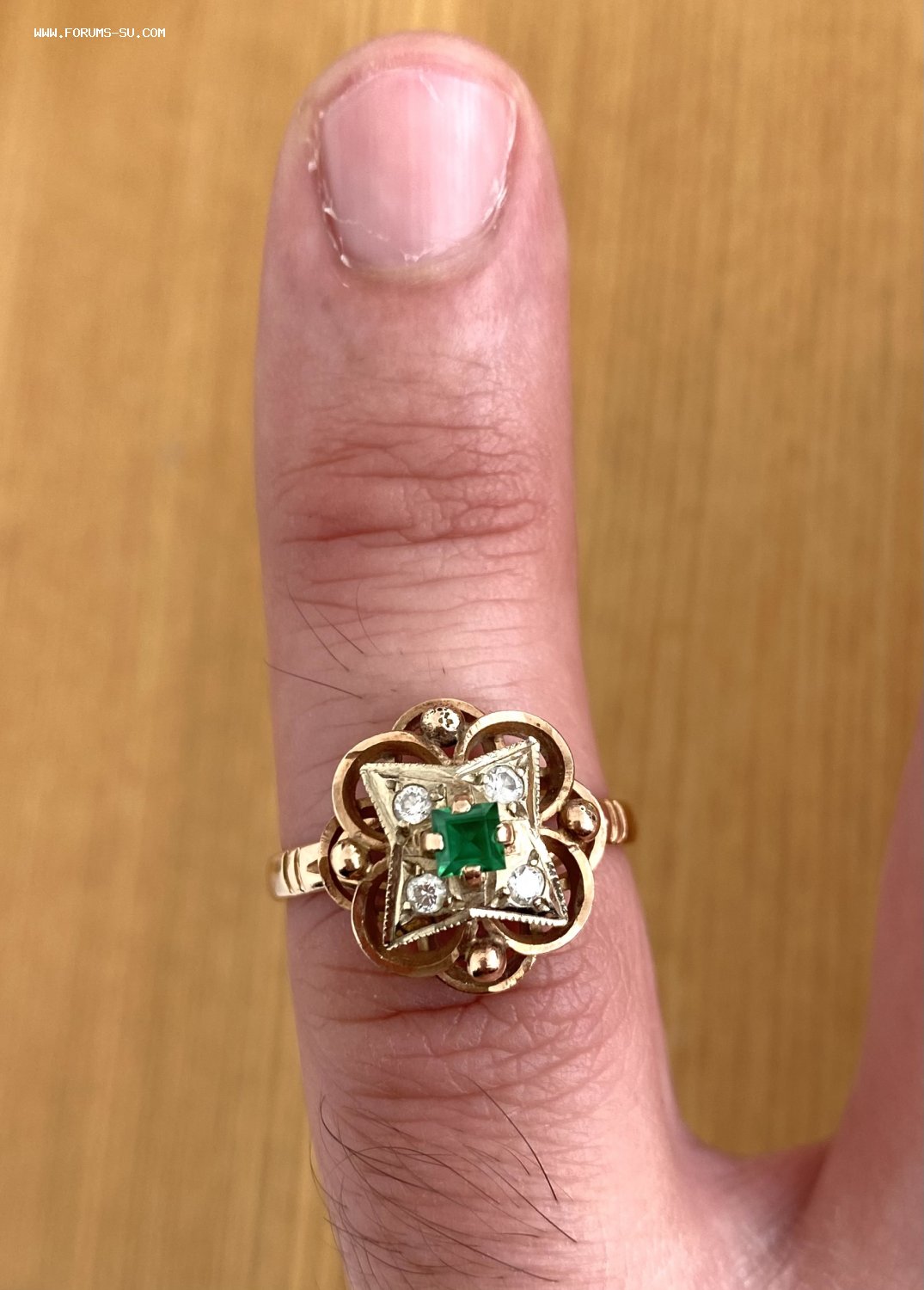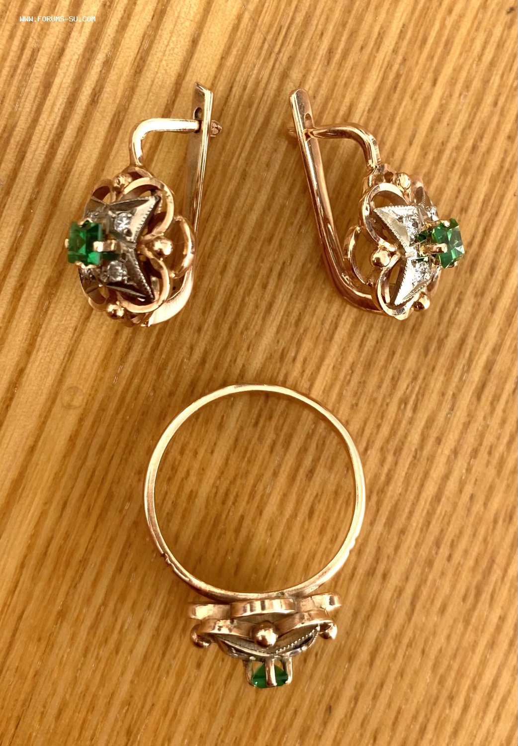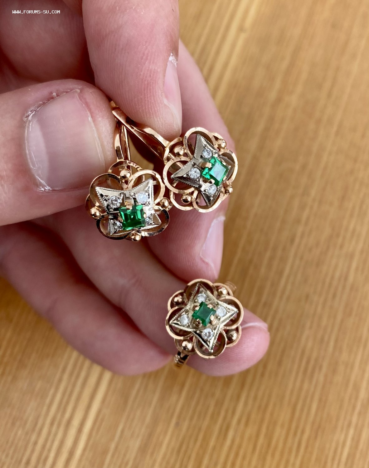 В продаже бриллиантовый гарнитур. Серьги и кольцо. Золото 585 пробы со звездой. Бриллианты. Изумруды. СССР.