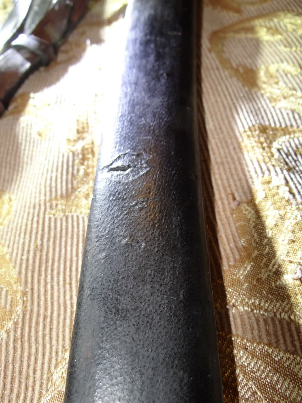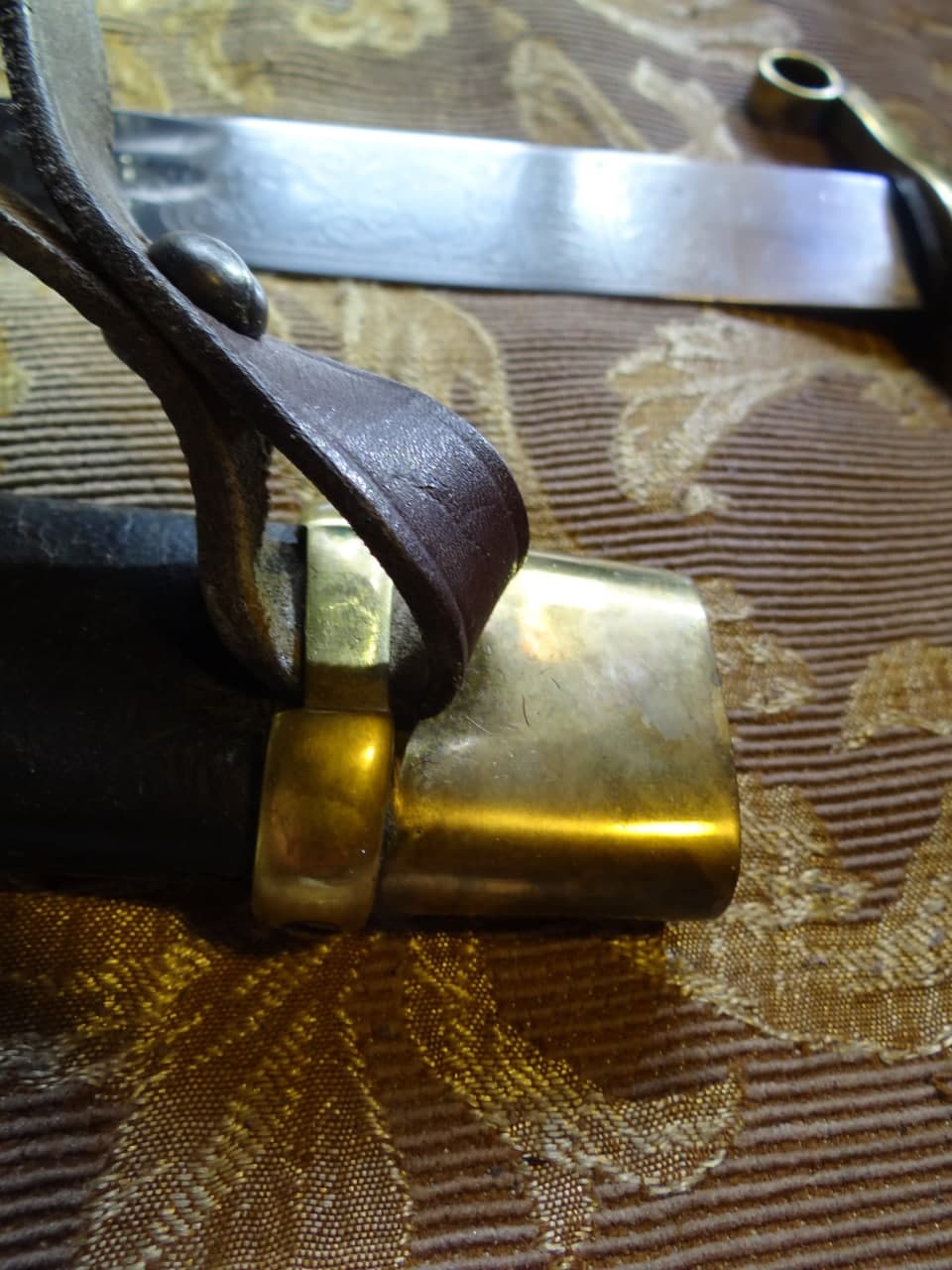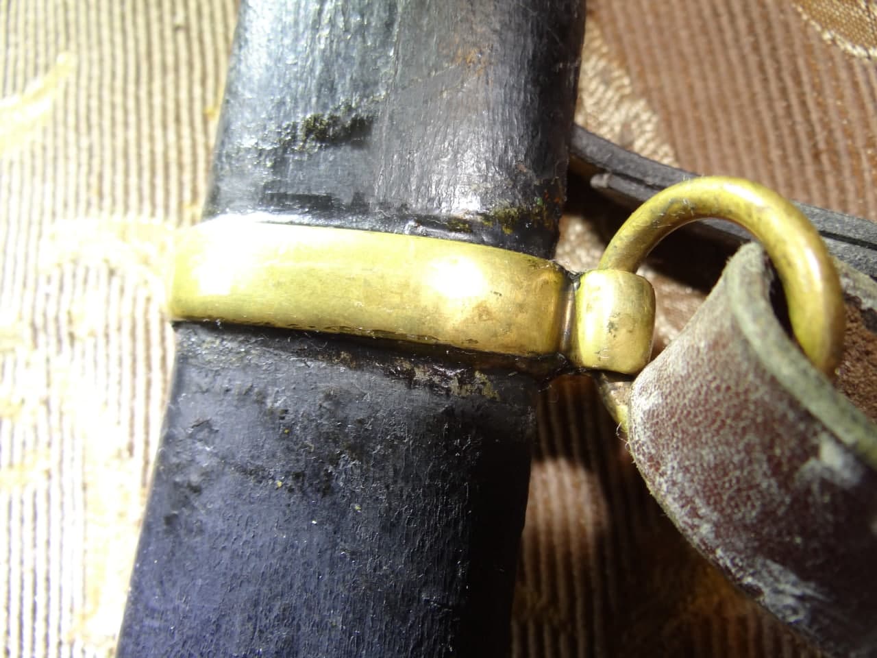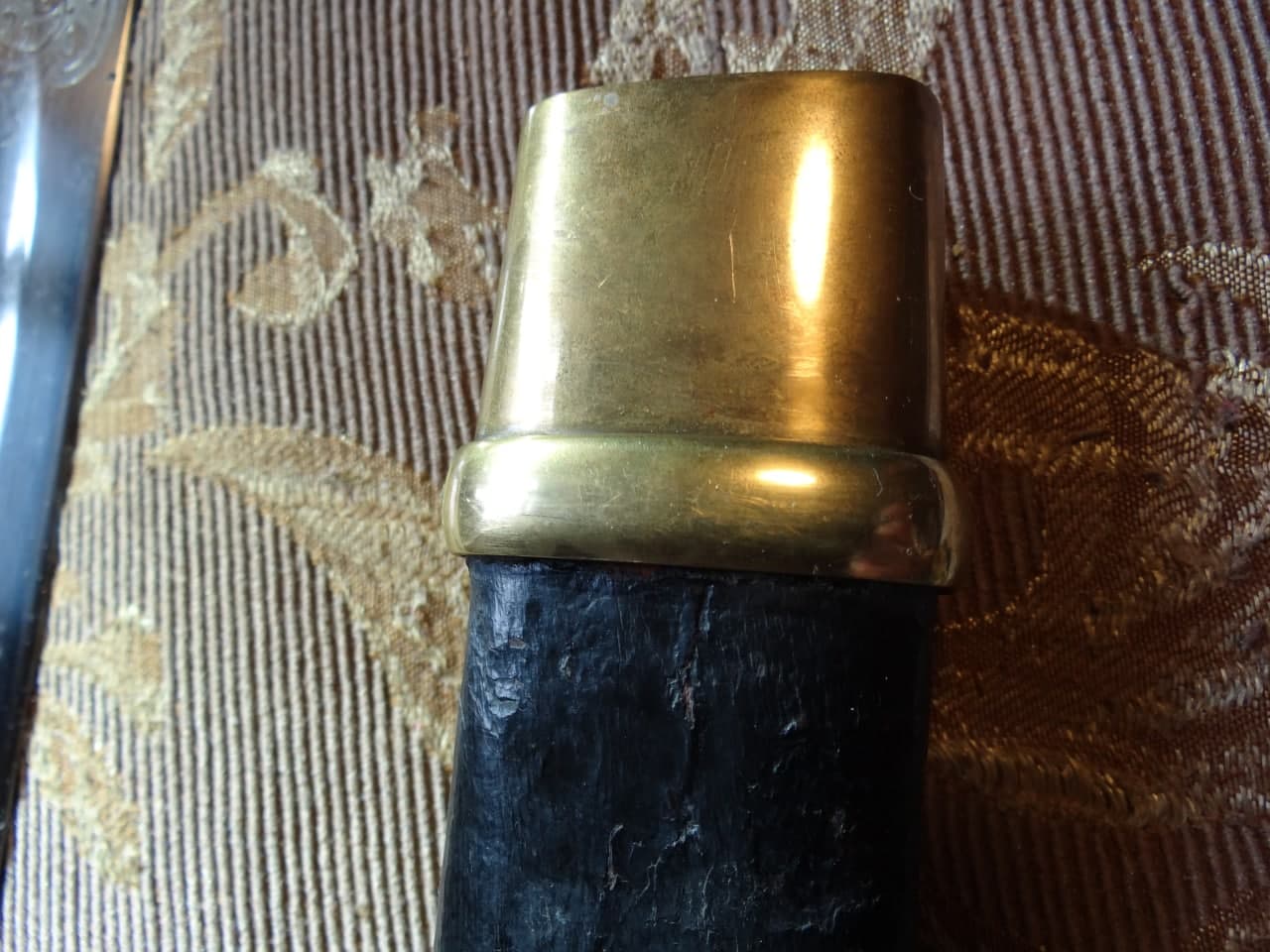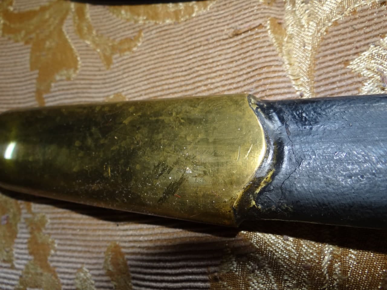 Реставрация скола на бекелите рукояти, реставрация наконечника ножен (все на фото).